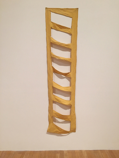 For all the frailty and danger of whimsy, Tuttle’s ‘touch’ comes from a tough quotidian take on minimalism. This approach, I believe, is explored with more clarity in the last of the upper galleries. Here, the space feels much lighter, and finishes the show with some earlier pieces from the late sixties. Tuttle asks us to focus our senses and scrutinise the vertical warp and horizontal weft of the weave that forms the textured surface on which the painter has worked for centuries – the canvas itself. This warp and weft forms the usually tightly-knit grid of the canvas that holds the paint in and on its surface. The grid in another context had at this time (late sixties) become a central and rather more portentous concern of high-end minimalist art. Pieces like Purple Octagonal, 1967, or Ladder Piece open up the hard faux-industrial edges of minimalism to the ability of textile and cloth to express a very human vulnerability and scale. These works feel thrown around the space, close to the ceiling and low to the floor. They escape the rather inward looking and framed doodlings or the more fussy and theatrical contraptions of later works selected.
