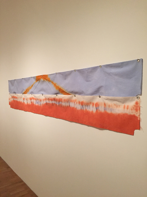 In the NY Times of April 2009, when Tuttle’s ‘Walking on Air’ series was first shown, Ken Johnson wrote: ‘As you draw closer, the optical, painterly aspect gives way to the tactile, sculptural dimension. You notice the grommets, the nails, wrinkles and creases in the fine cloth, machine stitched lines of colored thread and, in a few cases, added pieces of rope… Tie-dyed textures and blurry white lines nostalgically evoke hippie consciousness, and the sensuously philosophical marriage of the material and the immaterial is at once austere and sweetly seductive.’