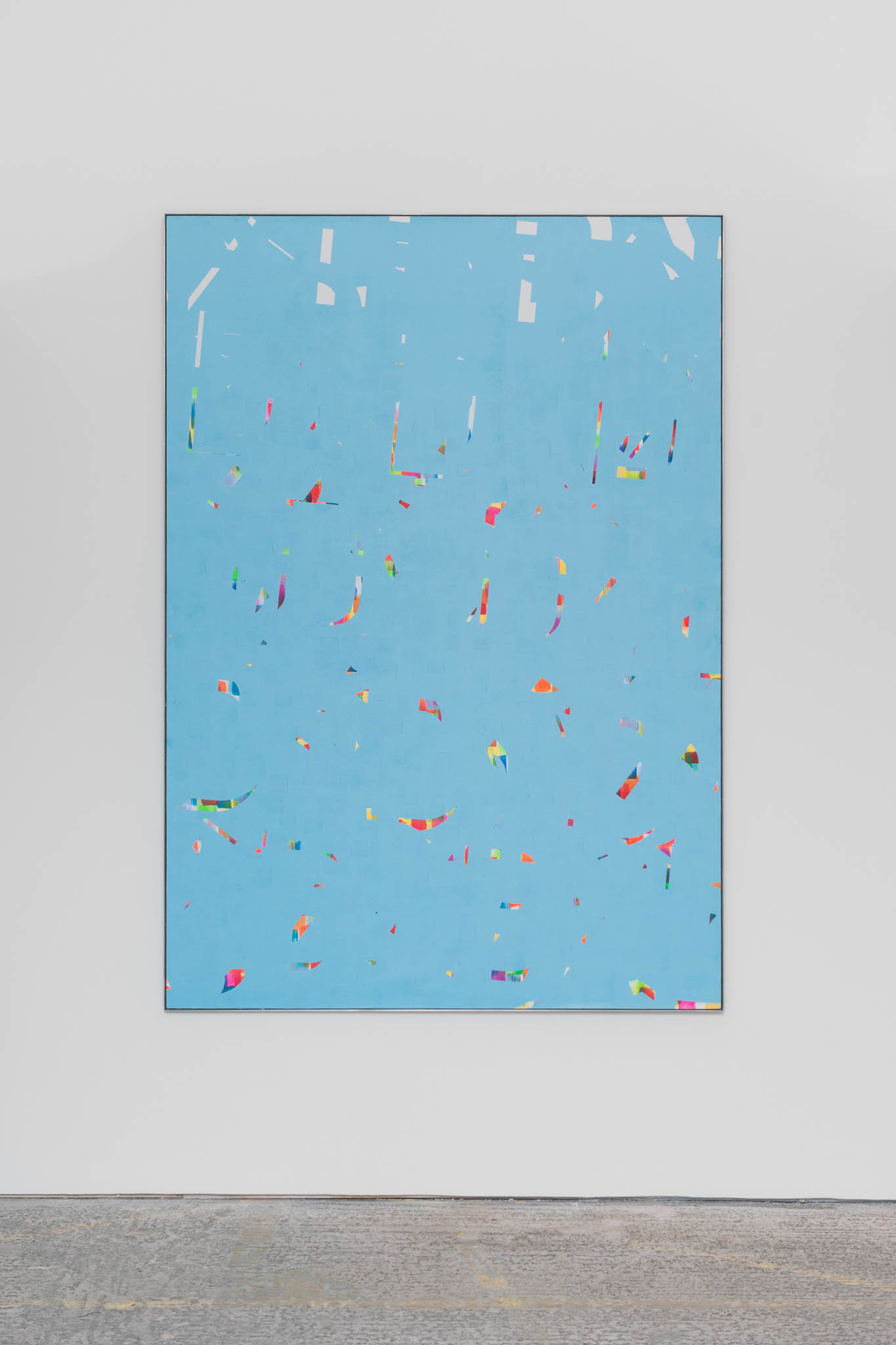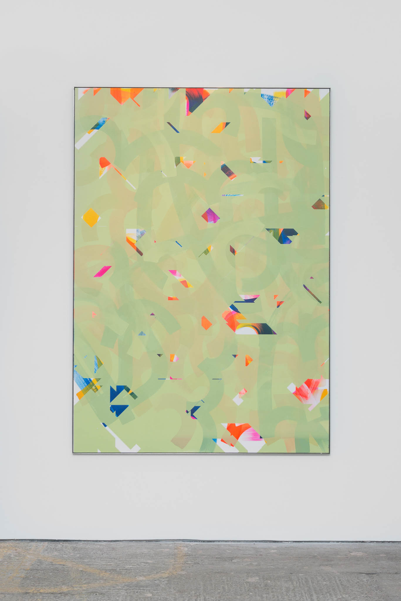 In ‘Untitled (DIN)’, ‘Lime Window’ (2015), and other works by Loesch, the hand painted brush marks are subsequently located behind the various UV-inkjet printed, meandering weaves or geometric shapes of light blue, lime green or other colours, and modified by these virtual brush or stencil-like shapes that have been rendered with a mouse or pen on a drawing tablet in Photoshop (or some similar program). These painted areas are typically part obscured by the printed digital interventions applied on top (the literal foreground) that act as portals and semi-translucent or solid shrouds.