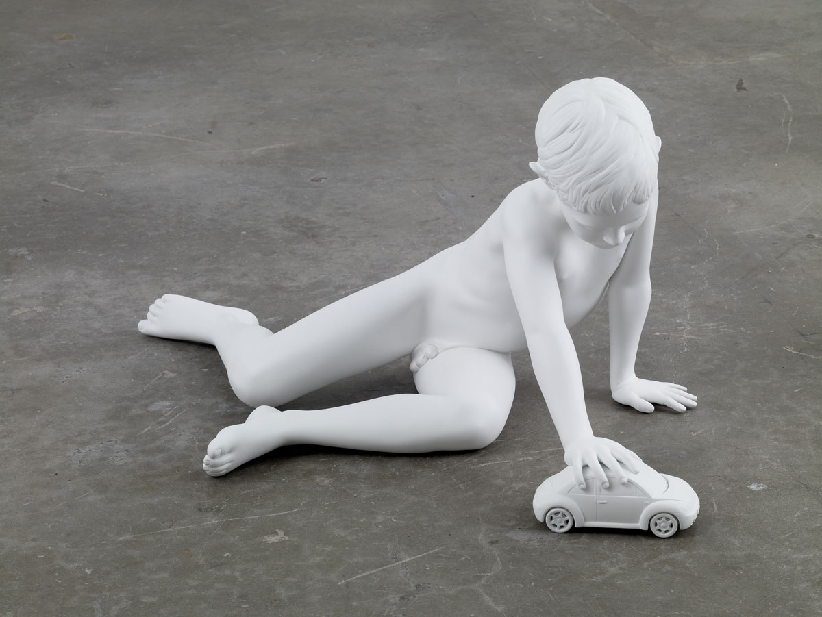 Whereas the surface of Hinoki is literally marked by signs of intentionality (in the marks left by the carvers’ tools), the surface of The New Beetle could not be more anonymous; that surface is composed of smooth steel painted uniformly white, apparently unmarked by any human touch. Nonetheless, The New Beetle is every bit as densely saturated with artistic intention as is Hinoki, according to Michael Fried. The pervasiveness of intentionality is demonstrated by the extent to which the long and complicated process of making the piece was dominated or dictated by the artist himself, who personally supervised every detail and aspect of the process. Ray began by photographing a four-year old boy, measuring various body lengths; a “figurative sculptor” was hired to create a clay figure, after which “Ray’s assistants took over.” After a year or two of investigating children’s proportions relative to age, Ray cast the clay, transported the cast to San Diego where another professional sculptor corrected the anatomy, etc., resulting in new molds, casting in stainless steel and assemblage at a fabrication factory. Fried describes all of this “so as to spell out some portion of the long and complex series of decisions, operations, delegations, and reflections – of intentions and their modifications – by virtue of which The New Beetle, for all its seeming simplicity, came into existence.”[xiii] While intentionality visibly saturates the visible surface of Hinoki (in the literal marks left by a team of wood carvers), the intentionality of The New Beetle is located elsewhere than in what we see when looking at the sculpture. It is found not in the work itself but in what we know about the artist’s pervasive control over every detail involved in the process of constructing the piece.