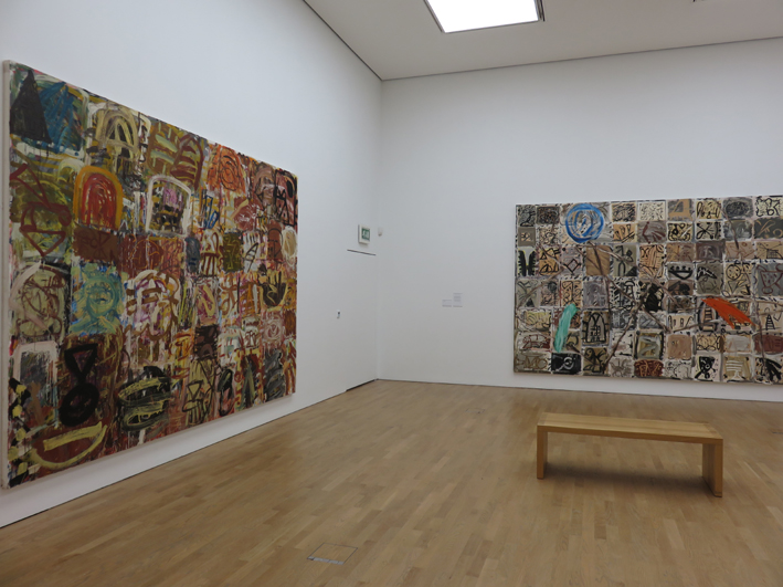 In the room at MIMA these two big, teeming paintings have room to breathe and are accompanied by two smaller ones, Full House made in 1984, and the larger Zenith from 1986. The former reminded me of the kind of exuberant mark making of Gillian Ayres paintings at around the same time, but hers with brighter colour. Full House with its different strokes and daubs anticipates the larger two in the room, while in Zenith the grid has gone and the forms are freer to move about in the rectangle of the painting, as in the larger one aptly called Smallness Stirs. The paintings have an immediate sensory impact, they play with density, complexity, space and texture; they are the seeds of the rest of his work which bloom into variegated and wild specimens, some complex and some with a mesmerising clarity.