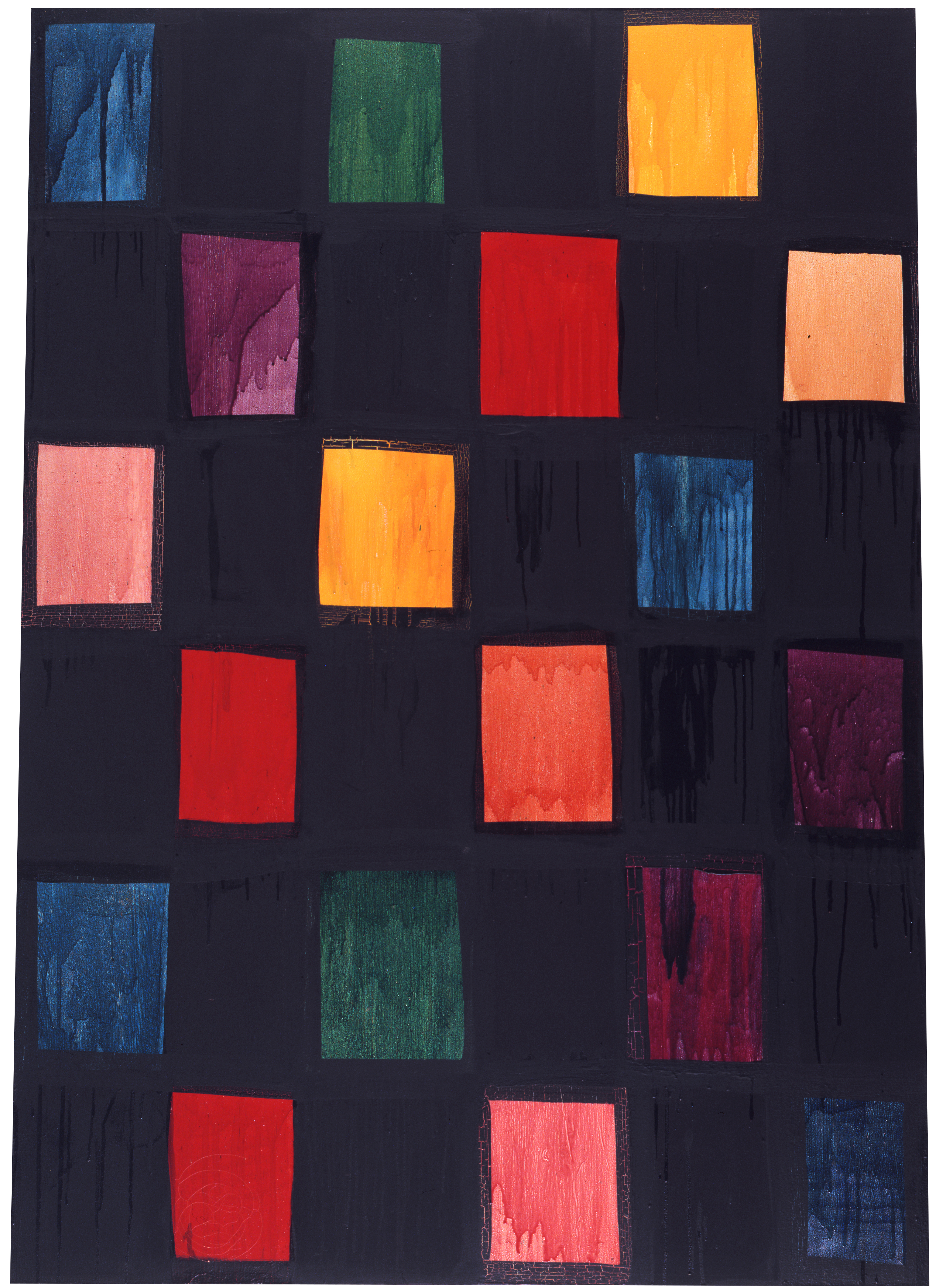 She’s comfortable revising the hidden or overt grid format and recycling compositional devices, fitting forms into the confining, facing surface of the tablet-like supports, but not insisting on geometric perfection or pure relationships. Though common property, she seemed to own rather than borrow the lexicon of formal elements. They looked homemade and were not deployed in any ludic process of appropriation or commentary, references to Matisse and Mondrian being rather half hearted.