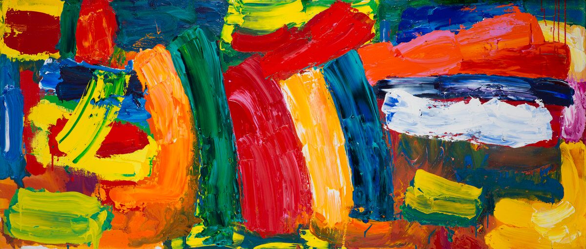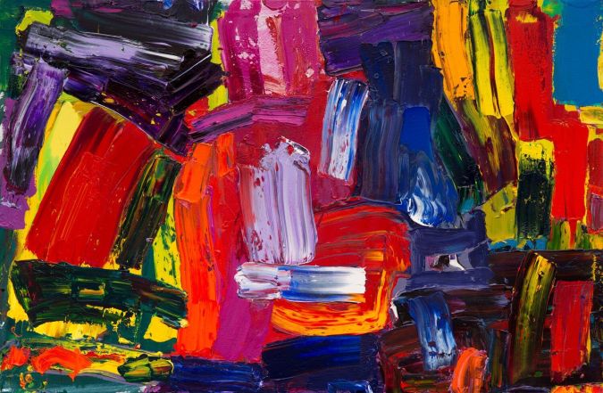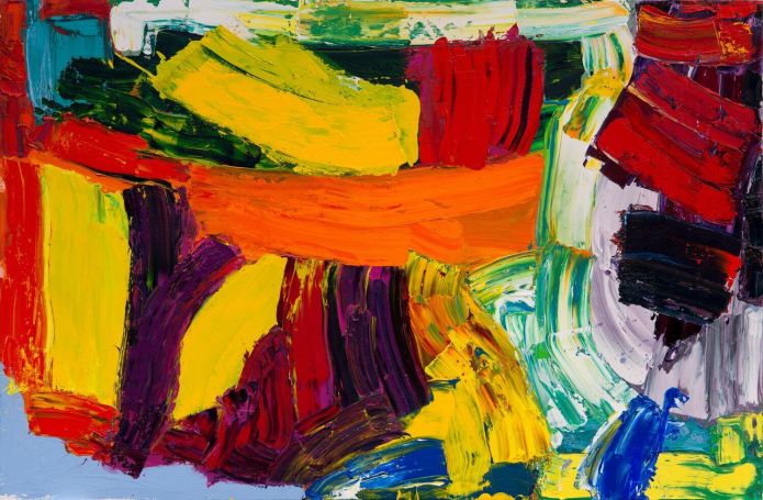 To the left, we see a curmudgeonly cadmium lurch into the scene, propped up by a spindly streaky green that doesn’t quite stop the red from laying a finger on a friendly orange – a nudging plea to be allowed into the party.
