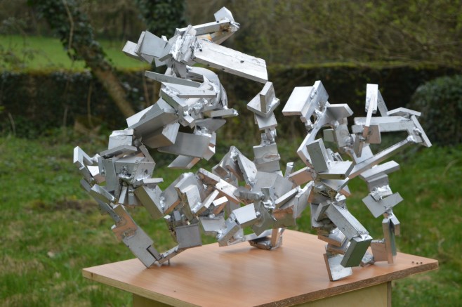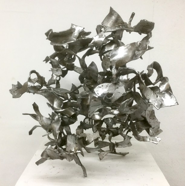 I thought Skilton’s Vivacious Viper was quite well served by the bubbling nature of the welds. In this bright and slightly reflective surface, built up of these crisp, hard-edged cube-like forms, the lumpiness of the welds may be saving this sculpture from becoming something too sleek. This sculpture felt fast to me, not in its making, but in how my eye travelled through it. The cuts of the aluminium and the texture of its surface, aside from the welds, is more uniform than in Greenwood’s Insignia and so you move through it quicker. That said, there are quite large portions of space to consider through the centre of the work, and surprises. The rising form that curls up over the rest of the sculpture for instance, at first glance appears to reconnect and touch what is underneath it, but instead stops short and hovers above. The relative distances between things in this work, and the degree of uniformity to the aluminium, suggested to me that Skilton in this work was thinking more about spatial articulation in Vivacious Viper than about the physicality of the material.