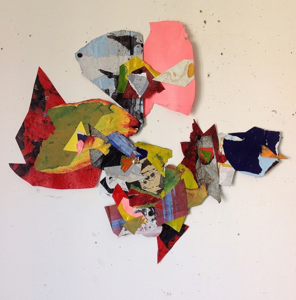Not that Bunker’s Rumleskaft (showing at Greenwich) did not throw some googlies into the mix. Unlike Umwelt, which was showing in the recent Testing 1<2<1<2 that Bunker curated at Unit 3 projects, and unlike all the works he exhibited in his previous Brancaster, Rumleskaft is presented in a white frame and suspended in Perspex, making the wall it hangs on visible behind it, and casting a shadow as it levitates in front of it. It is actually very beautiful, but possibly a distraction from the real content of Bunker’s work, and this show was not without its supply of similarly distracting elements, which I will address in turn. But to pay Bunker’s collage the respect it deserves, it is a work made up of all the necessary elements, and yet it is totally unconventional. It has great colour, but what does that say about it really? It has unique texture, but it is a collage after all. It has somehow made me want to bypass any inclination I may have had to unpack it in this sort of way. For me, one of the triumphs of this work, when you compare it to the ones from the previous round of Brancasters, is the way the edge of the total shape doesn’t create any sort of secondary figurative imagery. There is no silhouetting going on, and I think that has to be a result of the complexity gathering right out at the edges and not gravitating towards the middle. I think there was some pressure put on John to attempt this last year, but then he had to pull it off, didn’t he? If I may be permitted to draw some conclusions based on what he himself said at the Heritage Gallery in Greenwich, I think his approach to his elements, and how they meet the edge, manifests itself in the work. If you are not worried by the edge, the forms will just fall naturally around it, and almost by default, work to counter the potential reading of unintended figurative imagery in the outline of the whole thing, because it has been less preconceived. Aside from the frame, there was one issue I had with Rumleskaft, but it is perhaps not even worth pointing out. It concerned the small pink inverted tear drop shape that sits on top of the interrupted yellow triangle towards the left of the collage. I just found it a bit distracting. This may or may not matter, and these things often disappear with time.