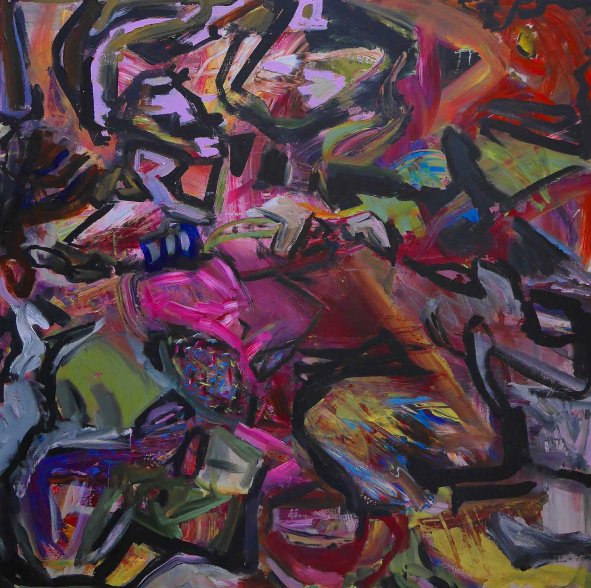 In Over the Overman by John Pollard there is also a challenge to traditional modes of creating space in abstract painting. Obviously it has colour, and the deep magentas or mauves are the ones that seem to permeate and resonate most strongly. It is a recessive hue, much more so than the pure blacks that are laid, almost drawn on over it. I get the feeling looking at this painting, that I am looking at a field of action that exists behind the plane of the canvas, and I think that is an extremely interesting thing for an abstract painting to be doing, if indeed it remains just that, an abstract painting. I was also detecting rather subtle uses of perspective in this painting, not only created by the black lines, particularly when placed on the diagonal, but also by the emergence of more clustering form like things at the top, creating a sort of advancing ceiling over the cavern of space in the deep purples. These perspectives are not definite. It would not register as an abstract painting if they were. But I feel they are there somehow, or at least creating enough of a division between forms, allowing for a bit of consideration before zapping off somewhere else in the painting, perhaps like Anne Smart’s scraping back into the paint. Busy paintings need this, I feel. There has to be some resistance to just skimming over the whole thing in a flash because there is nowhere to settle. If there was a part of this painting that bothered me, it was perhaps this small pink shape at the top edge of the canvas, sitting squarely in the middle. It seemed to jump out too much, and maybe if it did need to do this, it could have been somewhere less central. I wondered if its inclusion was too much of a conscious ploy to make the space at the top advance and seem further forward than the bottom, something worth considering for abstract painting in order to avoid feelings of landscape or groundedness. But you could do any amount of nit-picking with a painting of this nature. It’s casting its stone a long way out, I feel, and the potential gains of this sort of endeavour, to deny the plane in abstract painting, is something that could and has been guffawed at, but I think is a really interesting and worthwhile thing to attempt.