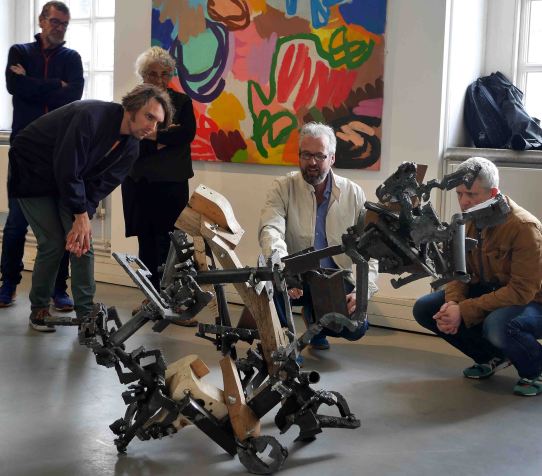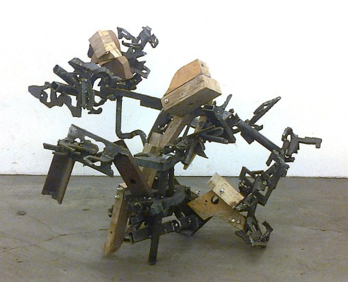 I found it appropriate that Bunker’s collage should be hung in eye line with and above Robin Greenwood’s Insignia, a steel sculpture incorporating wood. I’m yet to understand exactly what the commonality is between their work, and perhaps there oughtn’t to be. Nevertheless, there is something in the accumulation of bits, and what they add up to, and there is a certain boldness of character to the collage and the sculpture. There was always going to be a bit of a test involved in exhibiting Insignia, not just for Greenwood, who would be eager to see how the introduction of wood is received, but also for us, the collective viewer. Can we incorporate the wood? Can we integrate it, accept it and move on to more important questions? To be frank, I don’t know if we did come to grips with what the wood brought into the equation. It brings variety to an already varied articulation of steel, so it was not out of place in that sense. I suppose the lurking question for me was, if you are going to add wood to the mix, are you doing so because you want it to set up some kind of contrast, an added complexity perhaps? The trouble is, you don’t want the content to merely be that comparison, so the wood, like the found elements in a Bunker collage, but really like any material, be it paint, steel or bronze, to some extent has to be able to shed itself of its literal identity. That seems to me like a valid enough aim for abstract art to take on. I think the way to do that is through complexity, and Greenwood’s work has that in spades. It also seems to reflect what I’m detecting across people’s work and in their words, an ambition to challenge prevailing notions of wholeness, or at least give it some serious, perhaps overdue scrutiny. But another thing I found the wood to be doing, was it made the sculpture feel quite complete, even quite full in areas. I might be completely wrong here, but it was adding a certain kind of volume or density to the steel, maybe even denying any sense that the metal is merely “drawing in space”. Insignia at first appears to set up these rather large spatial divides between three or so main clusters of activity, but this feeling dissipates dramatically with further looking, as each part runs into another with such visual enthusiasm, the wood giving moments of pause to what is a demanding work.