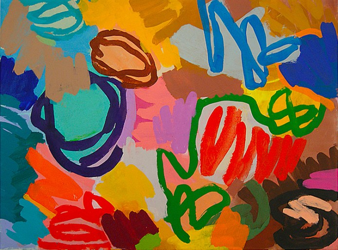 In Anne Smart’s previous individual Chronicle, there was some debate in front of the work and later in the comments section of the website about effects, and whether or not there is a greying effect at play in some of her paintings, not dissimilar to pointillism. The point (if you’ll excuse the pun) was not that the work itself was at all pointillist in theory or application, but that there was a similar result happening, in that pure hues placed in close proximity mediate each other and create another colour from a distance. In the case of Smart’s paintings, which have increased in colour at the expense of white in recent times, the colours were said to not be holding from a distance and becoming a kind of grey. I did not experience this at the Heritage gallery. I didn’t think the colour was the same from a distance as up close, but it remained strong and clear. From a distance, I was more aware of the reds and crimsons and yellows forming more prominent fields, and up close I became quite aware of the blues and blacks, and their intertwining with the warmer colours, which is to say nothing of the incredible surface and attention to detail, which isn’t really something associated with abstract painting, and so unique for that reason at the very least. Obviously there has been a lot of ‘detailed abstract painting’, but it is often quite contrived and gratuitous. The paint is paint in Smart’s Some Light. It is present, it is there, it is itself, and there is a wealth of it. It’s a real treasure trove of a painting. It’s juicy and fresh, and despite the presence of the paint, it is not impasto, it is never heavy. Another thing this painting is served well by is the scraping back into the paint, quite like drawing in a way. It appears to articulate subtle pieces of information, that can then be read as distinct things without any recourse to figuration whatsoever. They do not define these parts, as that would be too prescriptive, but they create some loose divisions and variety that can separate all this stuff and stop it from being swallowed up by a kind of all-over field. It is then up to us to decide which way we want to go, and how to connect all these things together. I think there is now a shift happening in abstract art in the way that we think about the balance between wholeness and the potential gains of putting ‘things’ in to a work.