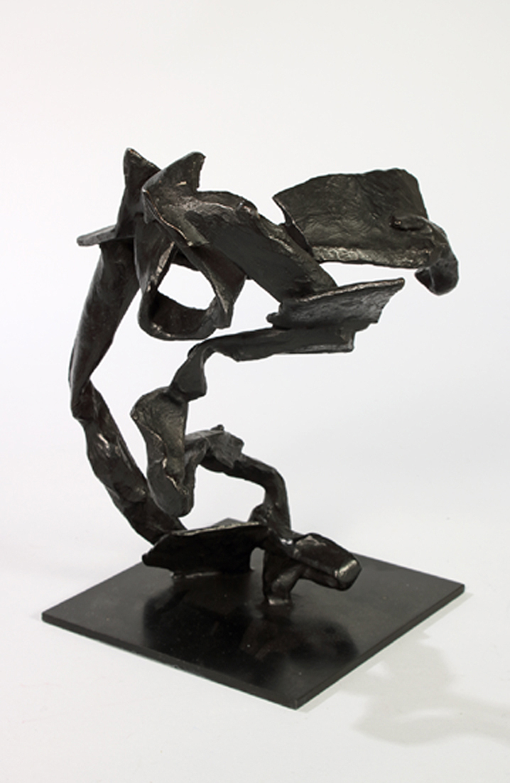 I found it appropriate that Bunker’s collage should be hung in eye line with and above Robin Greenwood’s Insignia, a steel sculpture incorporating wood. I’m yet to understand exactly what the commonality is between their work, and perhaps there oughtn’t to be. Nevertheless, there is something in the accumulation of bits, and what they add up to, and there is a certain boldness of character to the collage and the sculpture. There was always going to be a bit of a test involved in exhibiting Insignia, not just for Greenwood, who would be eager to see how the introduction of wood is received, but also for us, the collective viewer. Can we incorporate the wood? Can we integrate it, accept it and move on to more important questions? To be frank, I don’t know if we did come to grips with what the wood brought into the equation. It brings variety to an already varied articulation of steel, so it was not out of place in that sense. I suppose the lurking question for me was, if you are going to add wood to the mix, are you doing so because you want it to set up some kind of contrast, an added complexity perhaps? The trouble is, you don’t want the content to merely be that comparison, so the wood, like the found elements in a Bunker collage, but really like any material, be it paint, steel or bronze, to some extent has to be able to shed itself of its literal identity. That seems to me like a valid enough aim for abstract art to take on. I think the way to do that is through complexity, and Greenwood’s work has that in spades. It also seems to reflect what I’m detecting across people’s work and in their words, an ambition to challenge prevailing notions of wholeness, or at least give it some serious, perhaps overdue scrutiny. But another thing I found the wood to be doing, was it made the sculpture feel quite complete, even quite full in areas. I might be completely wrong here, but it was adding a certain kind of volume or density to the steel, maybe even denying any sense that the metal is merely “drawing in space”. Insignia at first appears to set up these rather large spatial divides between three or so main clusters of activity, but this feeling dissipates dramatically with further looking, as each part runs into another with such visual enthusiasm, the wood giving moments of pause to what is a demanding work.