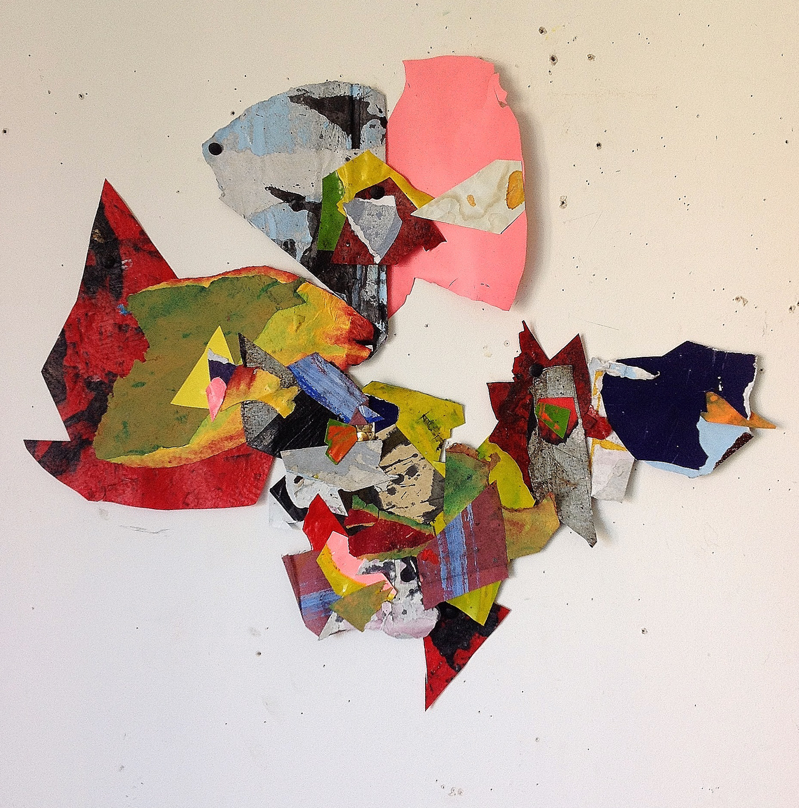 Not that Bunker’s Rumleskaft (showing at Greenwich) did not throw some googlies into the mix. Unlike Umwelt, which was showing in the recent Testing 1<2<1<2 that Bunker curated at Unit 3 projects, and unlike all the works he exhibited in his previous Brancaster, Rumleskaft is presented in a white frame and suspended in Perspex, making the wall it hangs on visible behind it, and casting a shadow as it levitates in front of it. It is actually very beautiful, but possibly a distraction from the real content of Bunker’s work, and this show was not without its supply of similarly distracting elements, which I will address in turn. But to pay Bunker’s collage the respect it deserves, it is a work made up of all the necessary elements, and yet it is totally unconventional. It has great colour, but what does that say about it really? It has unique texture, but it is a collage after all. It has somehow made me want to bypass any inclination I may have had to unpack it in this sort of way. For me, one of the triumphs of this work, when you compare it to the ones from the previous round of Brancasters, is the way the edge of the total shape doesn’t create any sort of secondary figurative imagery. There is no silhouetting going on, and I think that has to be a result of the complexity gathering right out at the edges and not gravitating towards the middle. I think there was some pressure put on John to attempt this last year, but then he had to pull it off, didn’t he? If I may be permitted to draw some conclusions based on what he himself said at the Heritage Gallery in Greenwich, I think his approach to his elements, and how they meet the edge, manifests itself in the work. If you are not worried by the edge, the forms will just fall naturally around it, and almost by default, work to counter the potential reading of unintended figurative imagery in the outline of the whole thing, because it has been less preconceived. Aside from the frame, there was one issue I had with Rumleskaft, but it is perhaps not even worth pointing out. It concerned the small pink inverted tear drop shape that sits on top of the interrupted yellow triangle towards the left of the collage. I just found it a bit distracting. This may or may not matter, and these things often disappear with time.