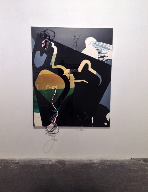The usually colourful Michael Stubbs shows a slightly subdued, ‘Solex Black Repeater’, (2008-17) – although the angular shapes and gestural rhythms of the expressionistically applied paint and looping wires provides a kinetic kick. With household paint, tinted floor varnish, cat 5 digital cables on mdf, at 165x122cm, it’s the second largest work on display, and the most visually imposing. Diagonals and curves force the eye away from the rectangle as much as within its funky spatial confines.