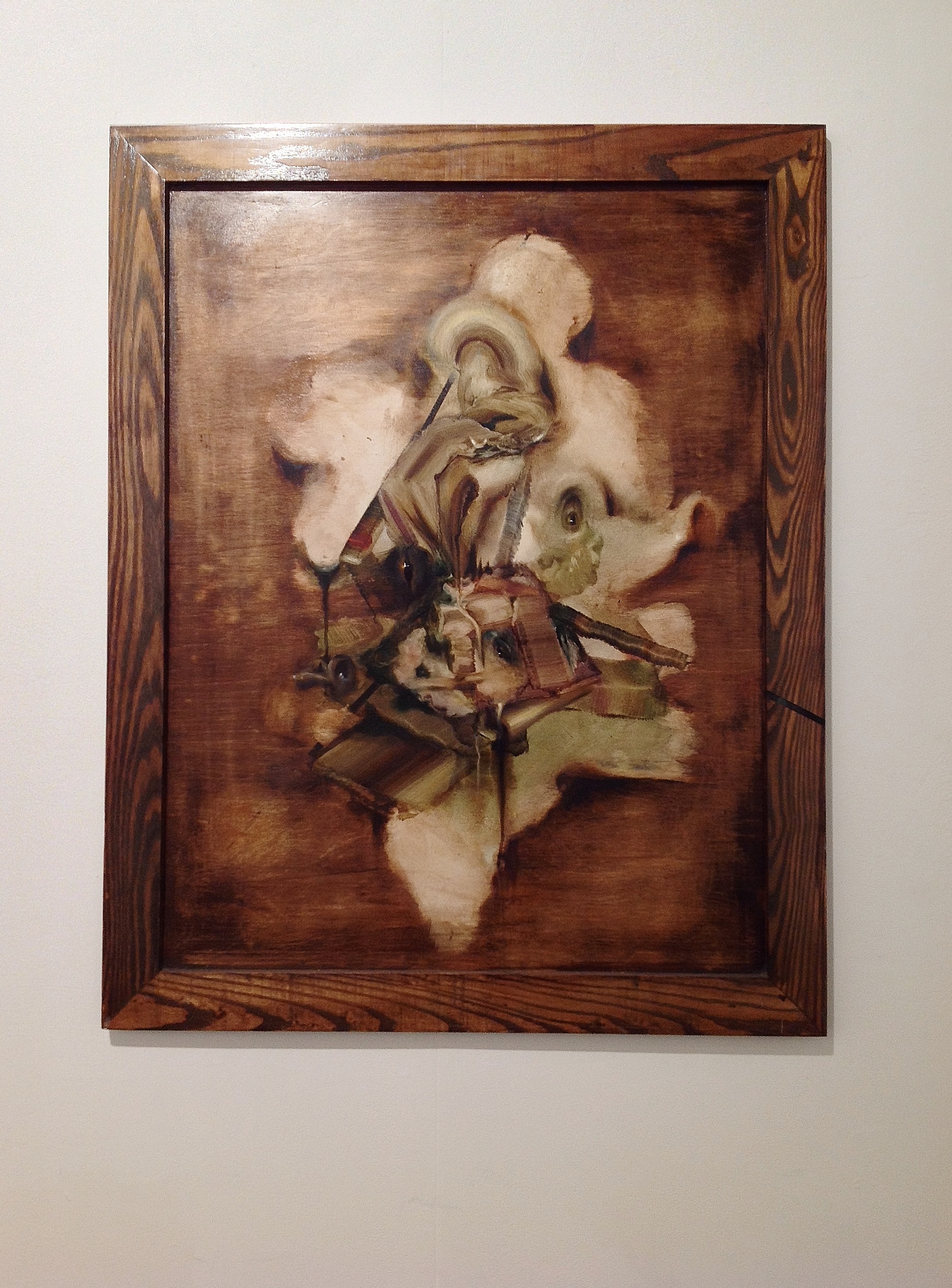 Finally, Bunker’s and Stubbs’ curatorial nous is revealed in what might be the least expected work in the show. Vicky Wright’s, ‘Torment of the Metals IV’, (2014) is an oil on panel anti-portrait. The tradition of easel painting might be invoked, but Wright gets inside the image as it visually collapses or unfolds, but retains a formal composure. Painted on the back of the panel, the image suggests that it could be inside or behind the conventional portrait head that might be on the wall-facing front. Undermining representation by allowing, or forcing, the oil medium to embody itself as some sort of primary matter and rejuvenating a subject area superficially appropriated by photography, this seemingly disintegrating portrait has an eerie, and anxious, Gothic/Sci-fi feel. The stain-like, Tachist, flat headed brush marks could reference the fragmented and imploding elements of Analytical Cubism. Given time to recompose itself (as if it were a still from a celluloid film played backwards) a face from the past might emerge – or could it morph into an 18th century English landscape by George Morland?