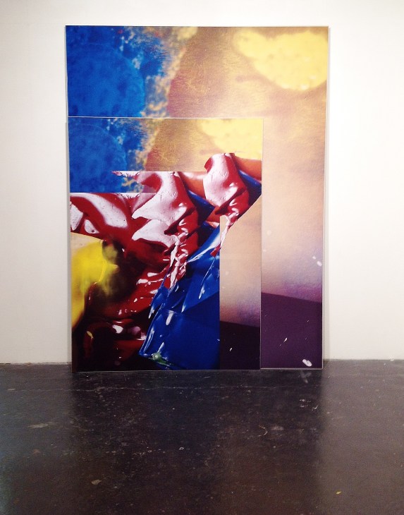 Starting the show, if read clockwise on entry, Peter Lamb’s, ‘A Slow Gaze Charged’, (2017), the largest work in the show, combines the photographic with reproduction, repetition and enlargement as a form of digital painting. A challenge to a more purist adherence to traditional paint media is immediately set up – but categorisation as collage as a materially real alternative to painting enables the sensuous colour fields to work visually, irrespective of medium or mechanical process. As with his recent history of production, especially since 2014, the handling and presentation of images has become more sophisticated in Lamb’s work. Typically, there is a sense of a continuous loop of self-reference and re-working that expands and serialises, rather than repeats.