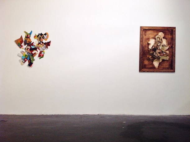 John Bunker has displayed ‘Frenhofer’, (2017) and ‘Buster’, (2016-2017), both mixed media, shaped collages, on opposite walls. These relate in a painterly manner to Stubbs’ lively image consisting of flattened, theatrical planes and gestures, and Wright’s unnerving, painterly portrait-like visual distillations. Followers of Bunker’s work will know that he is at heart a lyrical and linear neo-cubist of sorts, and that he deconstructs and reconstructs with painterly verve. He recycles the old or dysfunctional into new configurations – sans frame. At times the materiality is unruly – but the typically urban detritus, gleaned from city streets, combines with paint to produce discriminating assemblages. Chaos is avoided (just) by dispersing visually elegant and highly worked formal arrangements – creating a flavour of perverse lyricism – a paradoxical kind of painterly Punk.