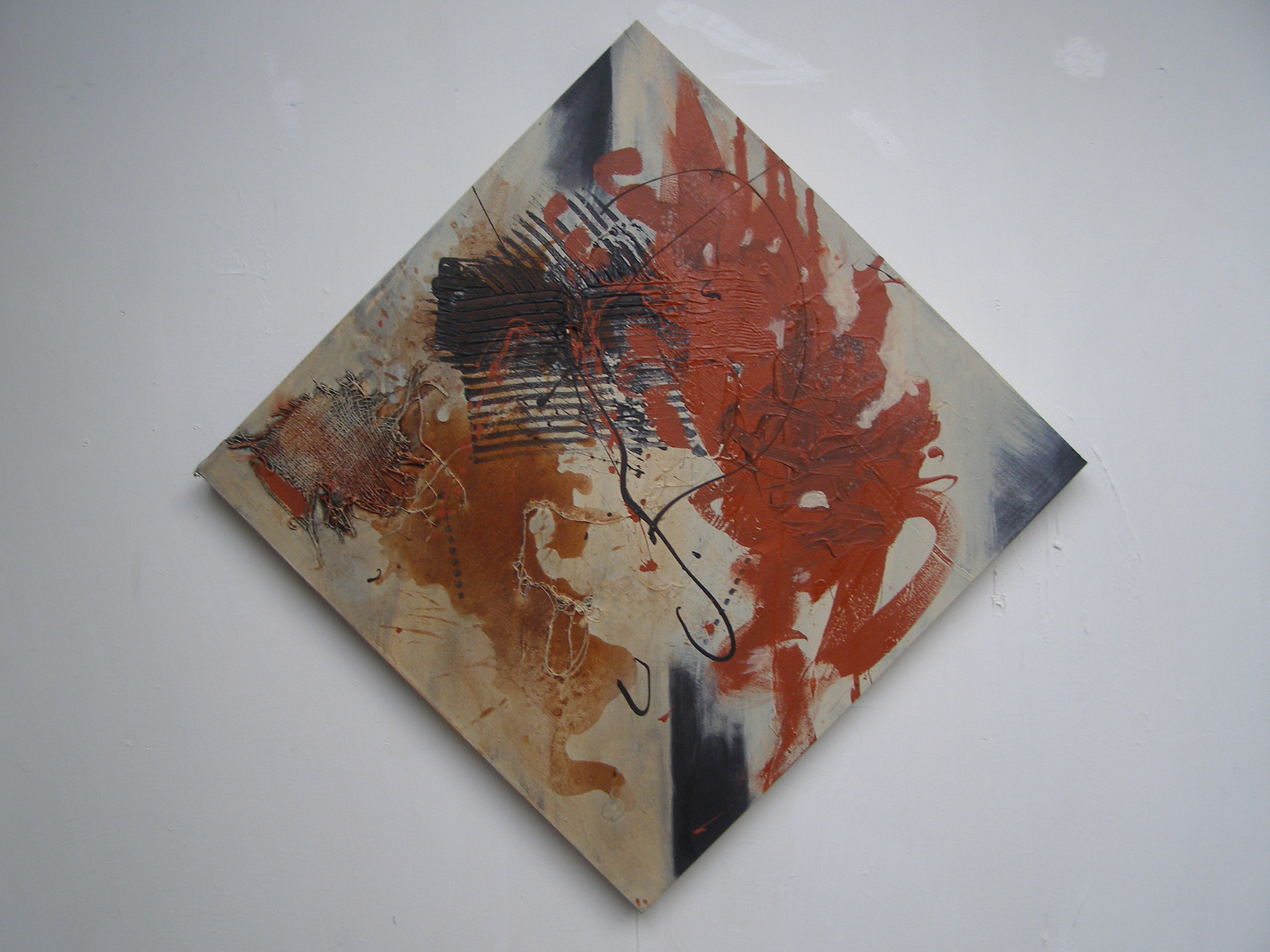 Great review, Noela. It’s a shame I didn’t get to see any of Nick’s work during my recent visit. I did however see quite a lot of Tapies in Madrid, as well as some Keifers and Burris in the States last year. From what I can glean from reproductions, Nick’s work is operating in a very different way from those guys. His seem far less literal, in that the inclusion of “foreign” elements into the painting does not seem to be the beginning and the end of the story. The burnt sacks in Burri often seem to dominate and conjure up readings of his work that are too biographical. The crackle paintings inevitably mimic a dry riverbed. The cement like paint in Tapies becomes impenetrable and oppressive, like walls or pavement. There seems to be more play, more elements and more integration into the actual paintwork going on in Nick’s paintings, that seems to make them about more than what they are made of, bypassing the associations we give to particular materials.