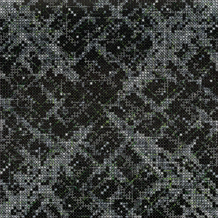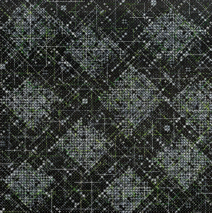 Ding’s crosses, then, may have become simply the language he uses, but their accumulated units prove ambiguous enough to allow both microscopic and macroscopic projections from the world, and at the same time to trigger multiple echoes of other abstract painters. Given that breadth of potential for suggestion, Ding’s work might be termed ‘hyper-pareidolian’.