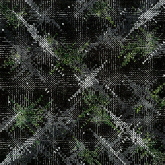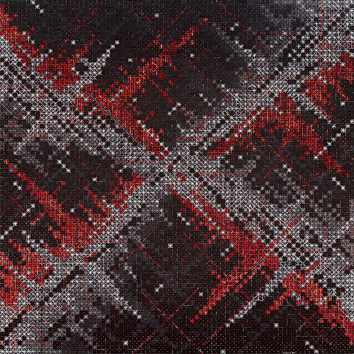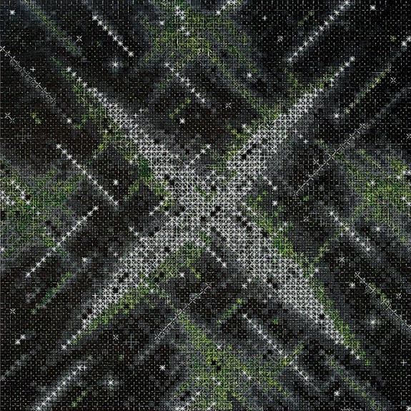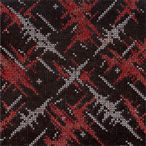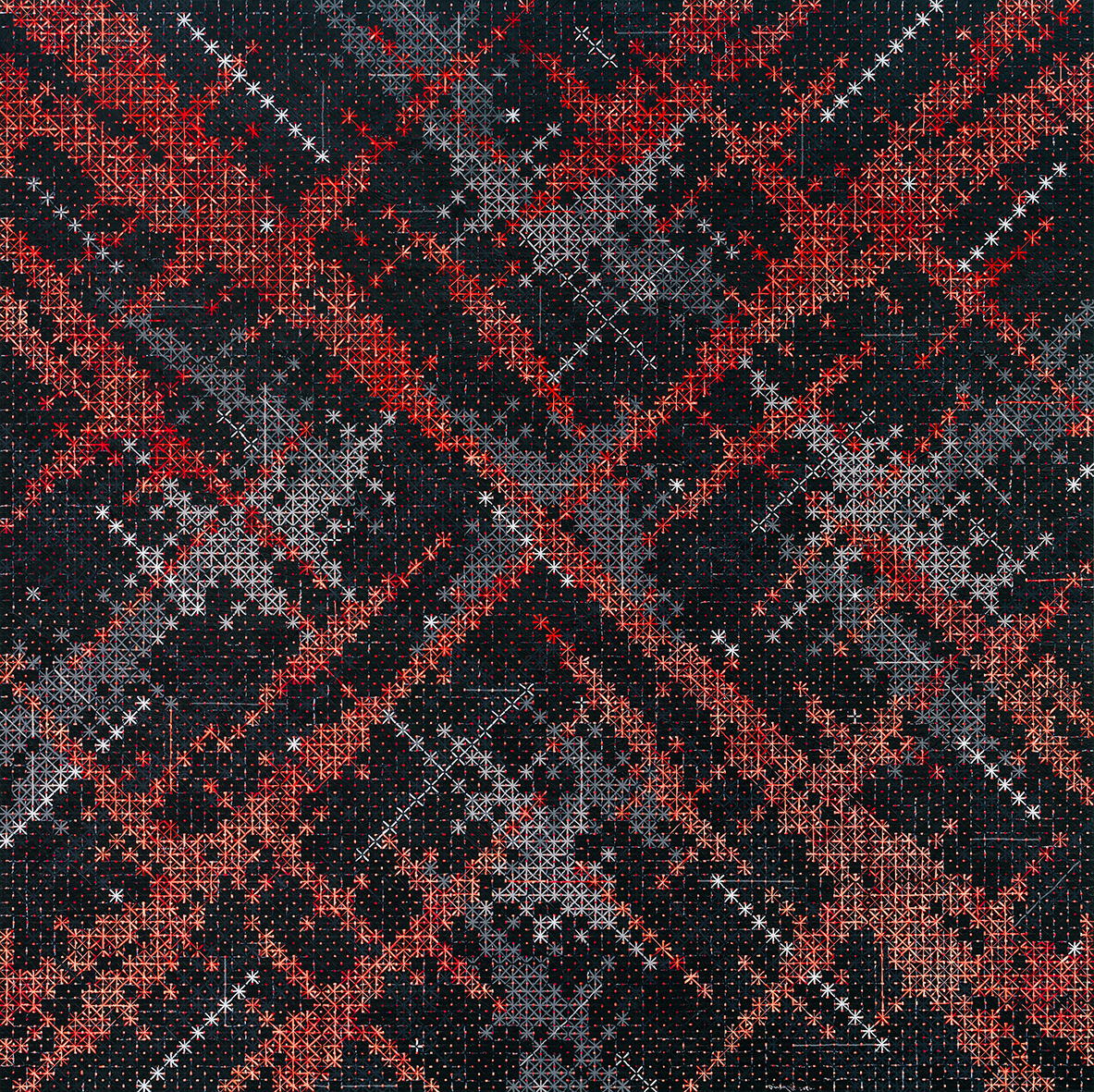 It is possible to read many subjects from the world into Ding’s abstractions: the graphic constituents of printing processes and the warp and weft of magnified cloth, yes, but also magnifications of atomic diagrams or cellular activity, computer screens full of coded information, illuminated advertising hoardings, scaffolding, a cityscape, the night sky… Moreover, the shapes made by the more prominent crosses operate at the macro level to suggest diamonds, TV static, or – in a neatly totipotent move – a cross or star (Appearance of Crosses 2016 – 7). It may be that little of this is deliberate, though Ding says that, despite being an abstract artist, in recent years he ‘has started to take note of the urban development of Shanghai’. That has seen its population grow by 10 million to 26 million just this century. That make it natural to assume an urban influence on his current work, especially as its fluorescent colours suggest the excitement and artificiality of city life.