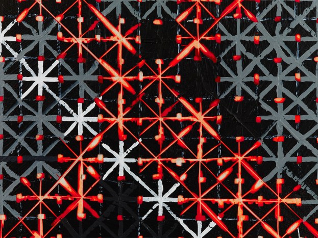 Ding likes to set himself constraints, and the show at Timothy Taylor consists of seven new paintings which are consistent enough to make clear the particular set he was working within in 2016. All seven are 240 cm square, and described not as ‘acrylic on wood’ but as ‘mixed media’, signalling that the basswood is an active material – not just a passive ground. All use black, white, grey and a chromatically close pair from what Ding says are ‘the six available fluorescent colours’: four of the new paintings use green and yellow, three use red and orange (the other fluorescent colours – blue and pink – don’t feature here). The paint is applied in pre-determined layers: in order of application we see a background of hot fluorescence which erupts through extensive black, which is applied second but then partly cut away, so evoking a woodcut. The top layer is of crosses in greys and whites of varying intensity, which destabilises the super-position of raked and diagonal grids.