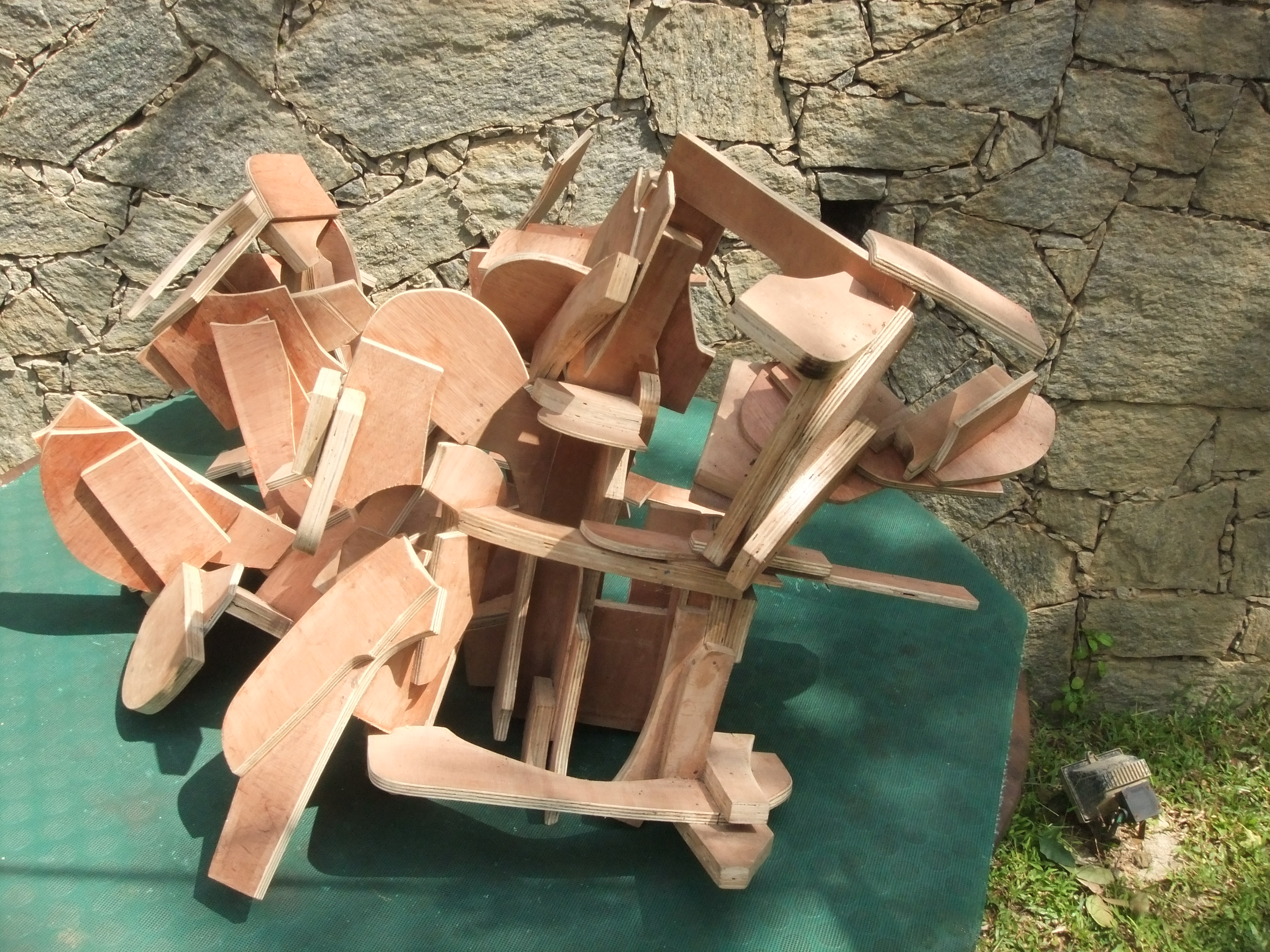 Goldsmithexile: To belatedly answer your technical questions: The plywood parts are cut from a standard factory sheet (8′ x 4′). The cutting is NOT intended to be SHAPINGl it is an attempt to create movement and direction to the building of the parts into the whole, movement and direction which in turn occupies and forms space; space which in turn is affecting and directing form parts.