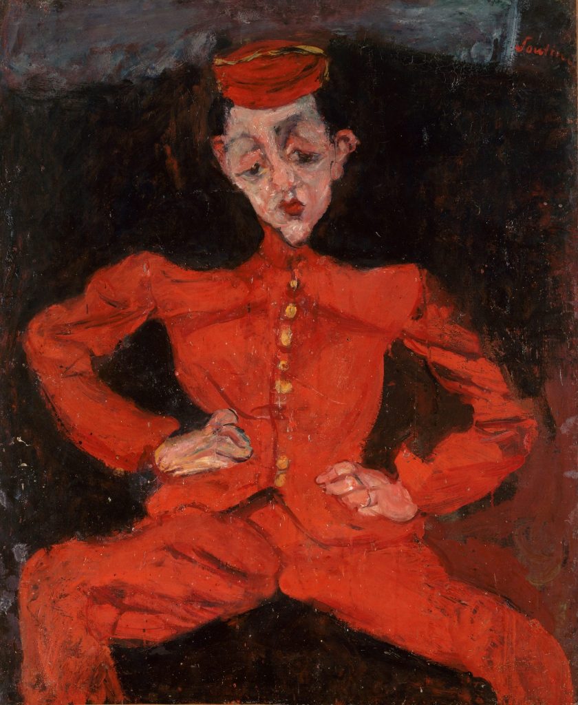 The good Dr. Barnes did Soutine no favours by investing so heavily in his early work. By thus lifting him out of poverty and setting him on a course of the support and patronage of wealthy collectors, it would appear that the portraits especially are designed to meet a ready market. Many of them are formulaic, though at its best the formula is a good one, consisting of a simple dominant chord, the opposition of red against dark blue and white, or white against dark blue or brown, the figures distended, arms on hips, with pointed shoulders mirrored by legs akimbo; a neck shrunken to nought with a large head perched perilously on top, or disconnected altogether from the neck. The arms too are frequently disconnected from the torso, and yet seen from a distance all this still counts as a body. It all rests on suggestion rather than coherent forming.