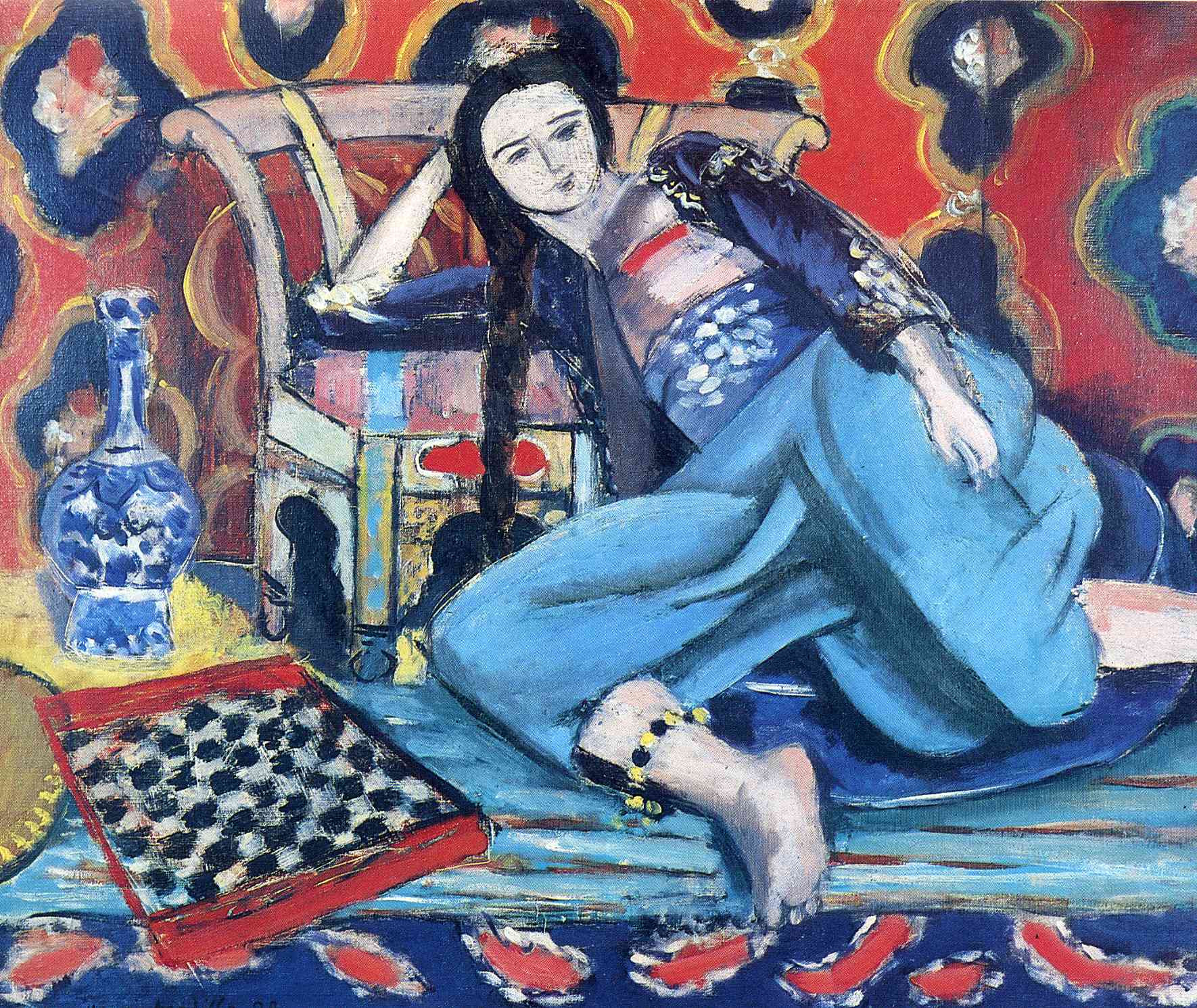 Odalisque with a Turkish Chair 1928 (MOMA.Paris) is the most powerfully drawn and heavily worked, hence the most Cezannian of the Odalisques, but the effect of the blurrings of the patterned background is vertiginous; as the figure plunges dramatically inward from the foregrounded floating chessboard, the pattern seems to undulate around her, and the vertical division of the background screen above her left hand further dissolves the apparent “flatness” of the screen, suggesting a mirror reflection rather than a continuous surface.