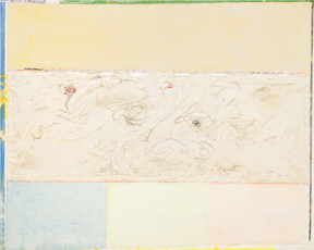 The exhibition title painting, ‘Fishes, Wishes and Summertime Blue’, another of the ‘white’ series, is strangely missing from the show. Perhaps the most straightforward embodiment of geometry in any of the paintings (as seen in the catalogue) it is a horizontal rectangle of subtly modulated pouring of light blue, mauve, pink and yellow with scrapings of white…and there is the thin red circle that appears in ‘Iona Miriam’s Christmas Visit..’ and ‘Stuarts Prediction’ but here it is singular and whole, but again with the top and bottom edges of the canvas lined with a thin strip of underlying canvas of a different colour emphasising the horizontal. I am reminded of an earlier, larger painting, from 2010, ‘Red, Yellow and Blue’ which has the same formal arrangement of a central circle in a horizontal rectangle but this is like the difference between a full moon and a new moon. It gives an idea of the range within which Bowling works. The full red circle of ‘Red, Yellow and Blue’ is collaged onto the yellow and blue ‘background’ and it reveals all the subtlety of paint application that the ‘white’ one does but with its variety of applications of red paint.
