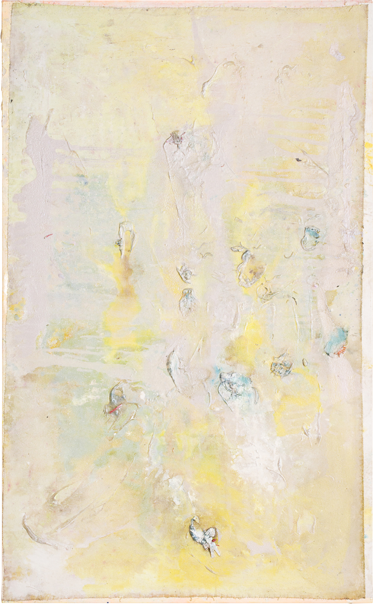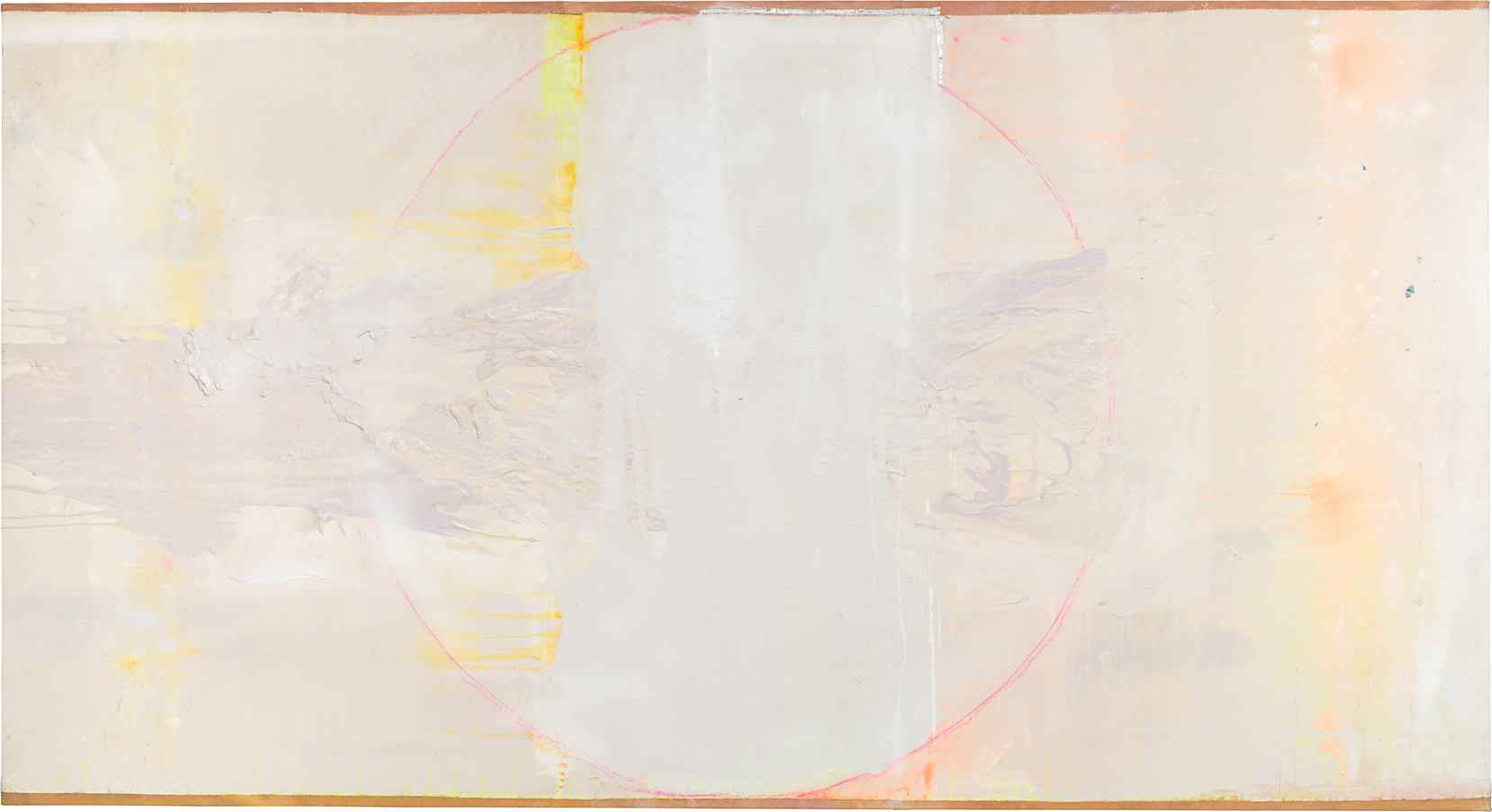 The largest of the ‘white’ paintings, ‘Stuarts Prediction’ is a horizontal canvas that has originally been a poured vertical one. The central area is defined by two things, a drawn red circle and in this a vertical rectangle of white paint; these both sit on a ground of subtly modulated vertical ‘stripes’ of pink and yellow. The central pour, with added gel impasto runs three quarters of the way across the painting and contains traces of a subtle violet. The run is broken by the unequal vertical rectangle of white mentioned previously, its top right corner emphasised by a right angle of metal zip. Vivid yellow runs spread away from the white on the top and mid left hand side. The potency of the painting is then emphasised by the white canvas being mounted on another that shows as strips top and bottom, their ochre colour holding the painting from expanding, thus emphasising its length.