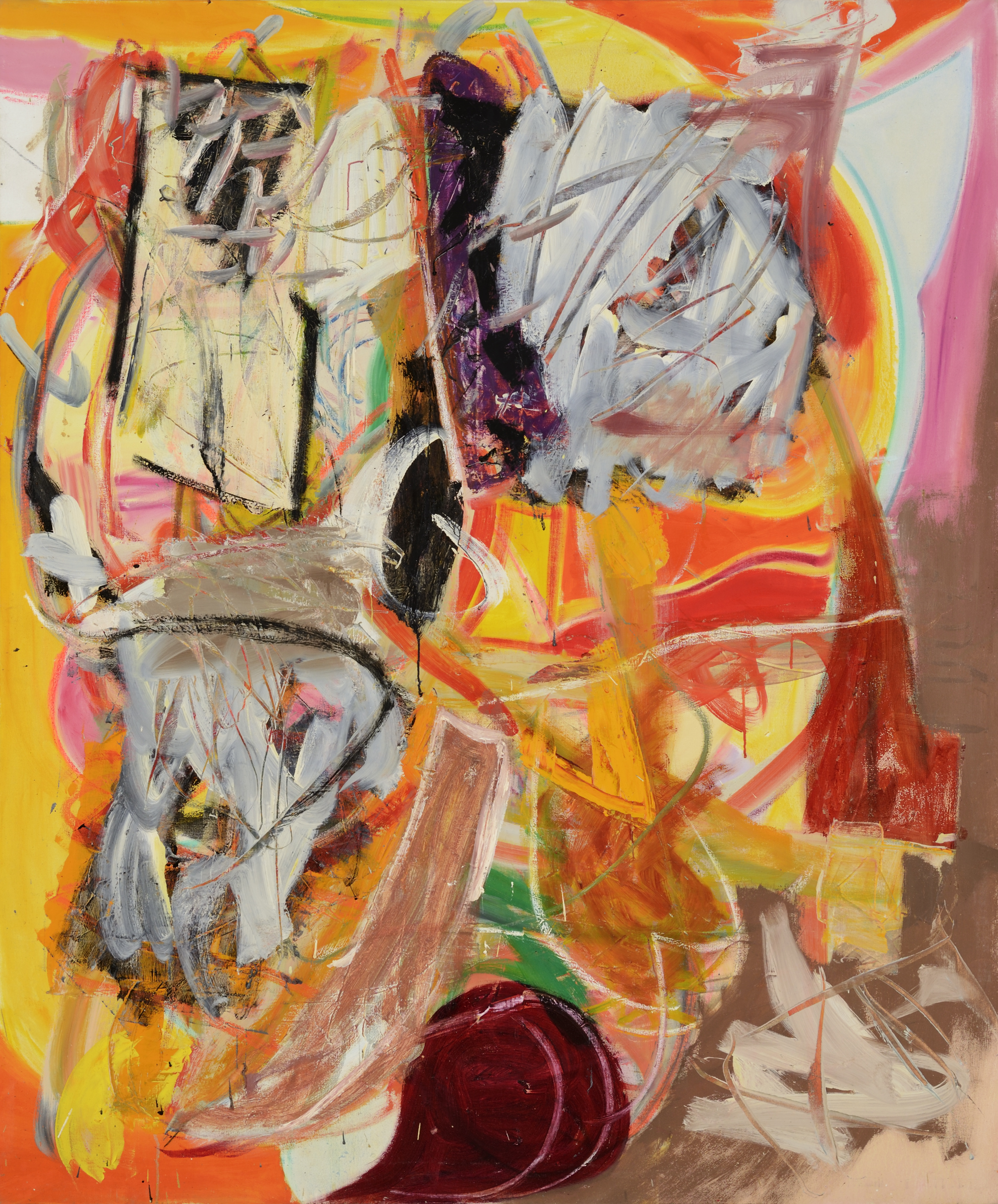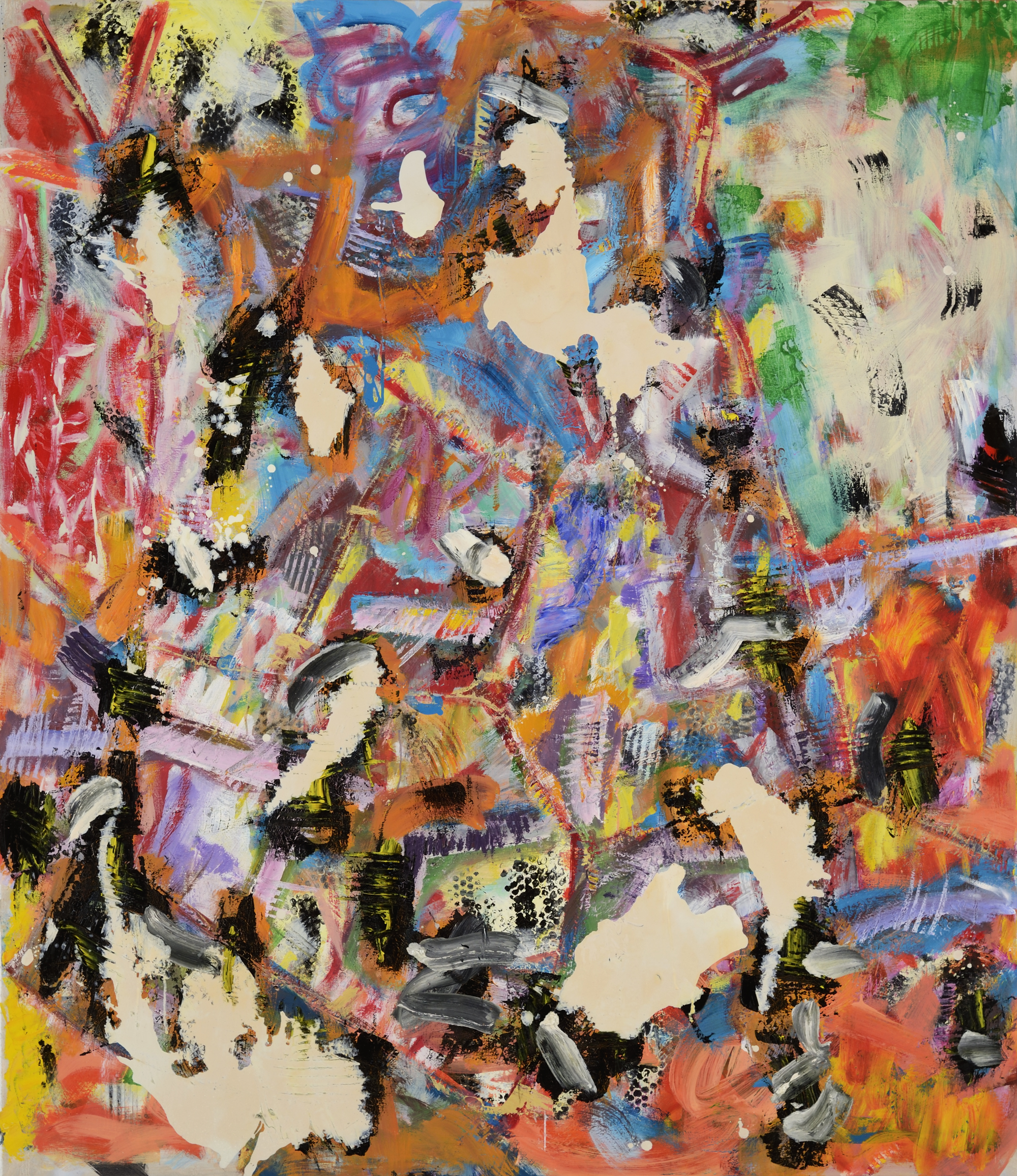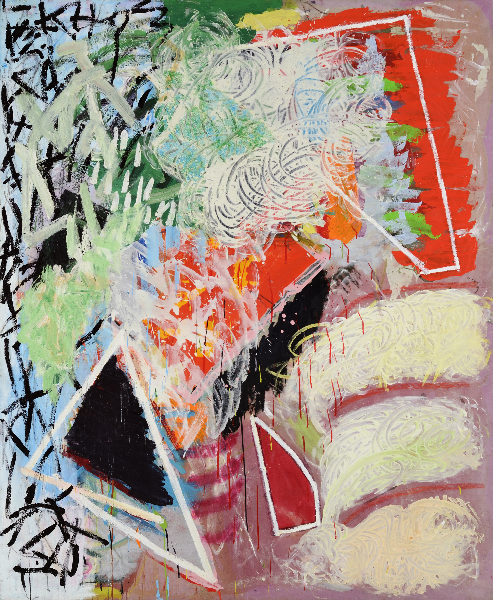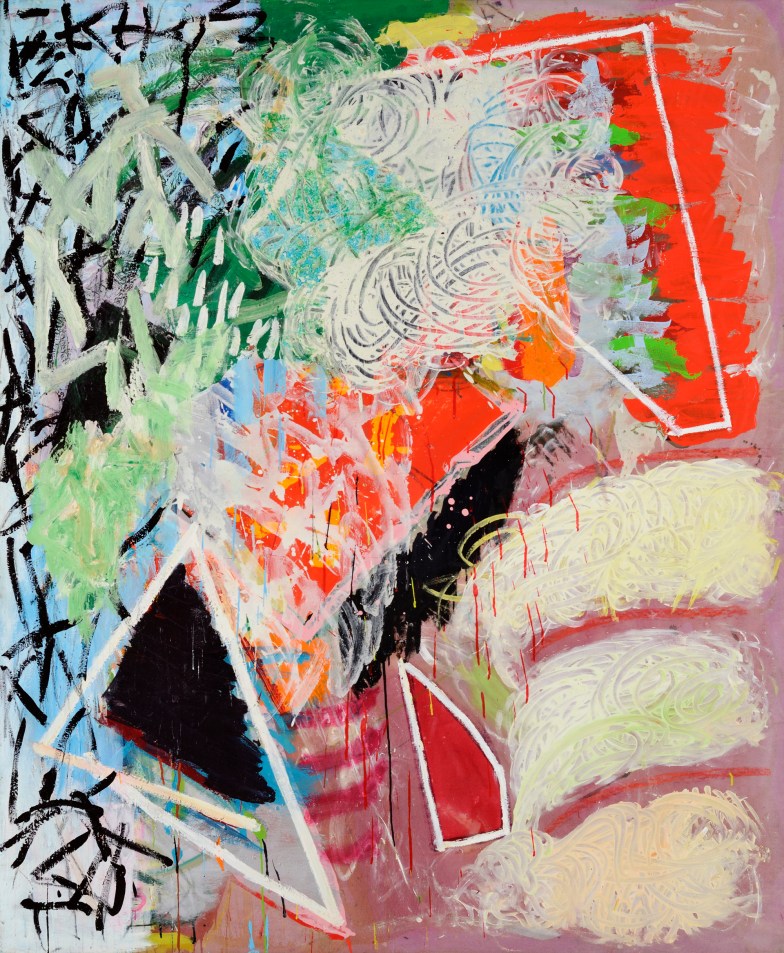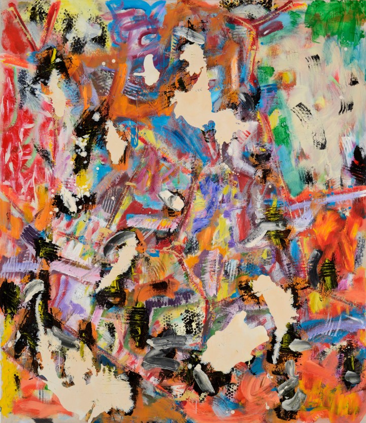 In ‘Carnival‘ there are a multiplicity of organising principles at work driven directly by the way paint is expertly manipulated in a myriad of ways in different areas or zones of the painting. There is a weighty density to the blacks in the bottom left/centre that sit within the triangular white shard pointing upward to the centre of the work. This is countered by another white triangle, this time holding in a strong deep red. This direct drawing is subtly subdued by a change in speed and an altogether different lightness of touch coming from the billowing creamy yellows rising from the bottom right. Suddenly the painting feels full of air and light. Any sense of a background starts to push forward and fragment as it does so, a powerful red pushes forward off the pink ground from top right to centre. It is held down by another white shard, larger and slightly more aggressively realised. Its points push out toward the centre right and out to the left seemingly to be challenged again by cascading pulses of longer black brush strokes splitting open and fraying the blue top left corner and snaking down the left edge. This blue ground then seems to atomise to become like a cloud of gas seeping through the angular black striations and mixing with the drifting creamy white and yellows and greens culminating near centre top. The greens here seem to be pushing out from left to right into the painting leaving the frayed blue left edge of the painting to lean in like a hugely enlarged section of a door frame from a Bonnard interior. Look at how four curved bands of a deeper richer pink twist open the bottom centre of the painting, spatially opening up the play of forms above so delicately. In all this there is the courting of chance, yes, but never a wholesale surrender to it.
