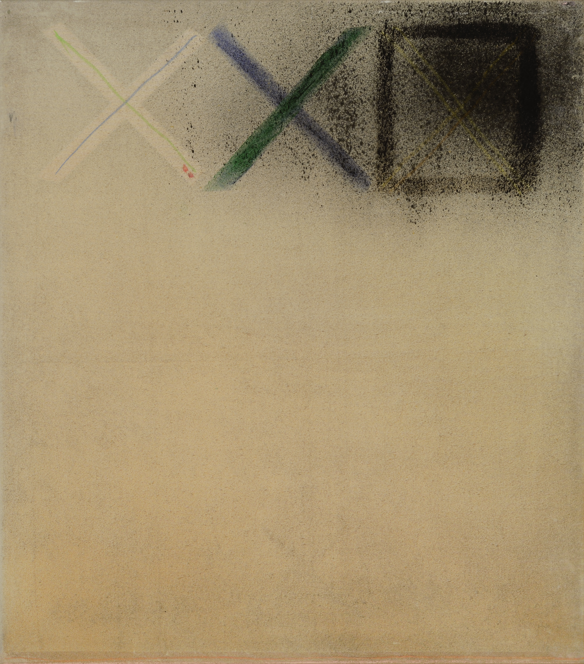 As I tried to outline above, citing Pollock and de Kooning would be too easy. I believe it would not do justice to the openness and decidedly diverse and mind-bogglingly differing energies at play in this show. Like the Ab-Exers mentioned though, Wragg is not afraid to use drawing in painting and because of that, I think, there’s a different and deft sort of physicality in operation that is all Wragg’s own. It appears throughout this show in many different guises, whether overtly as in ‘Subi’s Entrance’, 1984, or in an ethereal and subtle form as in ‘Singing Blood’, 2006-7. It’s a kind of spatial painting that does not need to be contained and ultimately subdued by some singular organising principle or other. There is so much abstract painting about that lives solely on repeated ‘forms’, grids or densely packed and worked rectangles that ploddingly push us across a painting in that sort of visual ‘call and reply’ type way. Wragg’s work generally does not rely on too-obvious colour contrasts or dramatic meetings of ‘edges’ to sustain interest. Nor are we expected to endure what an insightful critic recently described as ‘death by a thousand flecks’ where a painting becomes too granular, self-referential and mired in ‘process’.