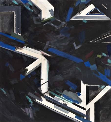 Even in the early works like ‘November Night Trees’ 1966 we are already dealing with a bringing together of somewhat contrary approaches to abstraction and Wragg is openly abstracting from a felt experience in the world. (He is happy to tell us how direct visual or felt experience has informed his practice throughout his career with excerpts taken from a major book appearing by the works.) Hard-edged box-like forms hang in an altogether dusk like misty drifts of greys, greens and scumbled blacks. Deep blue diagonals glow ominously as they flit through the darkness. This bringing together of a hard-edge vocabulary with a thin, atmospheric and lyrical painterliness at first might seem jarring. But in actuality a brooding and compelling tension is achieved through the orchestration of opposites.