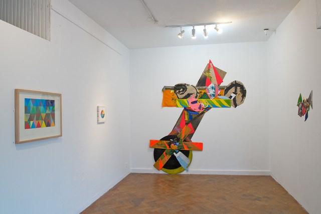 It was good to see the pairing of companion pieces, ‘Wall Flower + Just Blood and Shadow’ [2013-14] which pull apart the confines of the rectangle and set up a kind of double-portrait of abstract collage. Also, ‘Old Roan’ [2015], from the Tribe exhibition at Westminster Reference Library in 2016, demonstrated how two potentially separate collages could conjoin with just a slight overlap to create a duality that feels resolved. Bunker’s last show (Leave It….) at the Unit 3 Project Space confirmed the independence of his collage from painting as such, but these slightly earlier works (especially ‘Ram Raider’ that was first shown at Fold in 2014) pre-empt the indicative installation element of current progress. In fact the placement of the wall-based assemblage, ‘Ram Raider’, subtly leaving the background of the wall by its placement on the floor, added an indicative installationist dimension to the exhibition that had been explored by O’Donnell’s ‘Floor to Ceiling’ corner construction. This work, which takes the paintings and drawings back into three-dimensional space, activated an otherwise typically dead space. Likewise, a temporary wall painting by Cole (‘Anthropo-scene’) gave strong hints of what might provide a potential follow-up show that could tip over into arenas of so-called expanded painting (for “painting endures” to reference the short manifesto presented by the curators) which evolves without necessarily rejecting its own history.