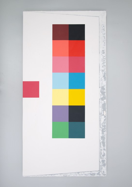 If we extend the sobriquet of ‘super-cool’ to two of the participants’ work, Patrick O’Donnell and Philip Cole appear to have it in spades. But their work is so very different. O’Donnell’s combined paintings and drawings are calmly uncoloured from black to white, in tones that are perceived in, and extracted from, segmented architectural spaces (and could be based, by implication of extended time invested in looking, on observational drawing more than photography); whilst Cole’s works present (rather than explore) printed colour palettes that will be found tucked behind the glued down forms of mass-consumption packaging.