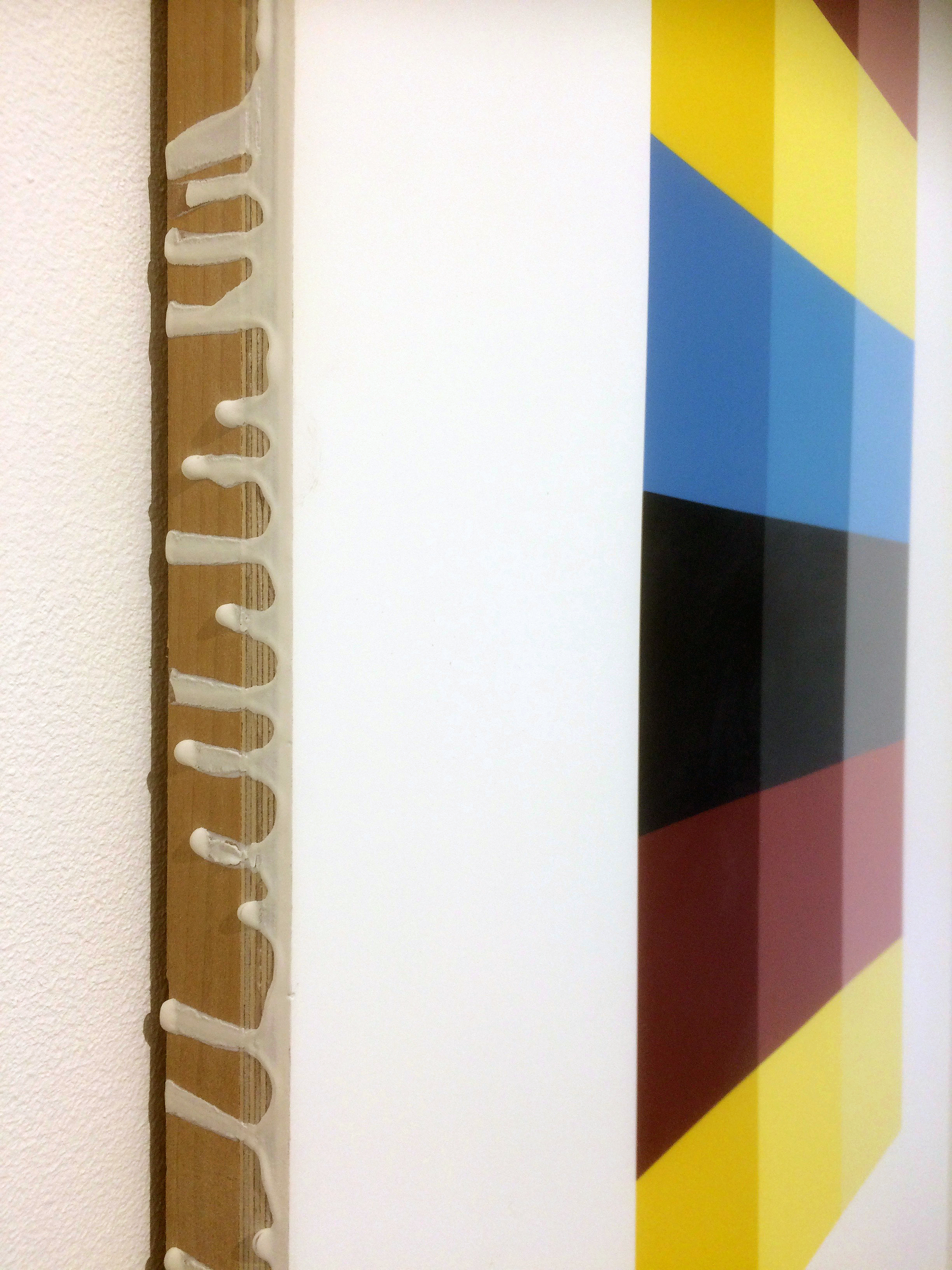 Brushwork. There is another tome to be written here but not by me. But just a comment about drips on the side of a painting. Phil Cole works with coloured resins on strong horizontal plywood mounts pouring resin over the assembled coloured elements of the painting. The resin flows over the edge quite naturally and unavoidably as an expression of the process. This surface is sanded back to a finish that is free of brushmarks, precise, colourfast and extremely beautiful. The whole is thoroughly authentic and devoid of accident except the side is left as it flowed and formed and hardened. Where does this idea come from that this is familiar, that somehow it does not relate to lived experience? I’ve not seen work like this before and it is Phil’s lived experience every day that he goes to the studio.