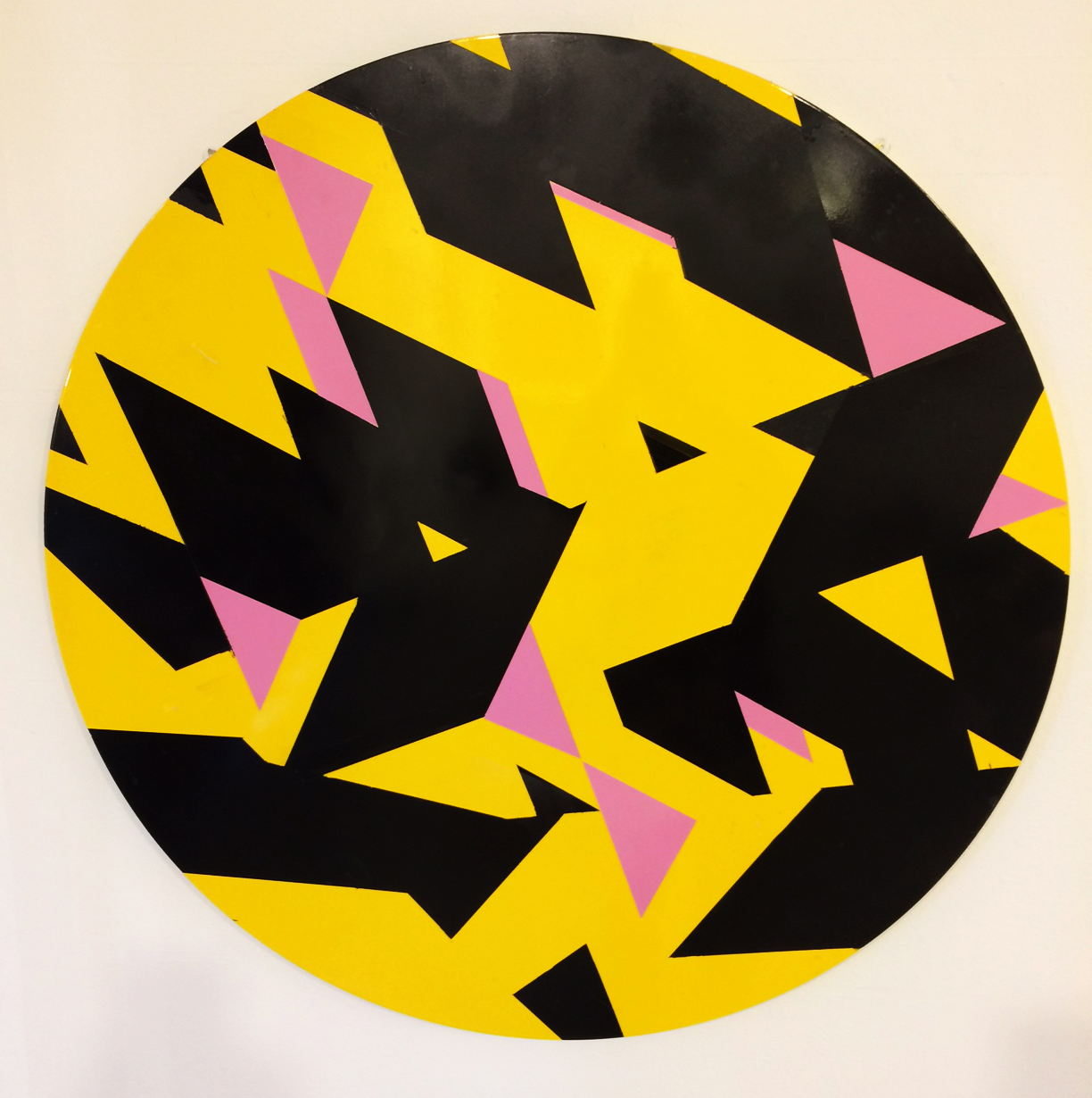 Also working with imagery with an architectonic feel is Ian Boutell (he trained as an architect at Manchester University). The freedom to develop a more individualised art practice was established more recently, having completed a degree in Fine Art as a mature student. Several works made from Perspex are displayed which form collage reliefs, but it is his two tondos that stand out in this show. ‘Never Ending’ and ‘Falling’ involved spray painting and the use of tape to make loosely geometric but fragmented de-constructivist compositions. The yellow and black stripes might reference hazard-warning tape that is used to cordon off off-limit spaces and initial doubts about this methodology for constructing so-called hard-edge abstraction (recalling early Sean Scully) initially left me feeling indifferent. But having given more time to view the surface of ‘Never Ending’ close up, I was perversely pleased to notice subtle changes in the gloss and semi-gloss black surfaces. Edges of yellow had leaked as some of the paint had penetrated beneath the masking tape during production. Deliberately leaving the technical faults on view, however subtle, gave way to evidence of the handmade process that had undermined refined slickness and a machine-like perfection. These two works also balanced the strictly geometric form of the disc with an inner revolving sense of movement created by Wyndam Lewis-type Vorticist zigzags and restricted choice of flat colour.