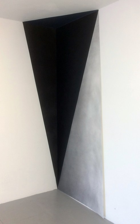 Patrick O’Donnell’s charcoal and acrylic paintings also present a highly refined and controlled production process. But where Cole’s colour palette includes (at least by implication) every primary and secondary subtractive colour mix, O’Donnell’s stark imagery is devoid of colour but full of silent pathos. There is a sense of severe understatement about the flat and planar, but perspectival, folded forms that characterise the essential features of constructed spaces. Oddly, a first impression was of segments of non-organic geometric form taking on the persona of the still life or the anonymous portrait. The sober and dignified, monochromatic images also emanate an emotional kind of piecemeal, but visually resolved, architecture. There is a sense of the mnemonic fragment of the particular about these quasi-domestic monoliths.