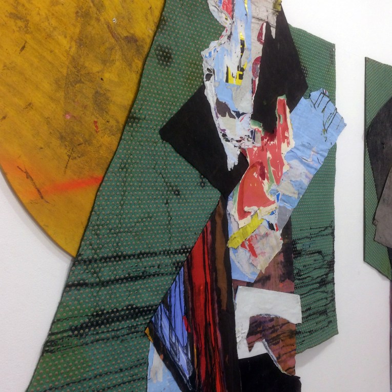 John Bunker’s collage work is well known to Abcrit readers and his employment of risk and spontaneity might have precluded him from this show, but the ‘considered’ and ‘balanced’ placement of found collage material with painted or printed visual content expanded the potential of predetermined rules or recipes for abstraction. The inter-relationships between the melded, shapely parts and the concrete materiality of various mixed media combinations – linked by overlapping or overpainting – makes the work visually persuasive as being in and of the inhabited, social realm where materials and imagery have potential for attaining the aesthetically beautiful or it’s dialectical sparing partner – detritus and wastage.