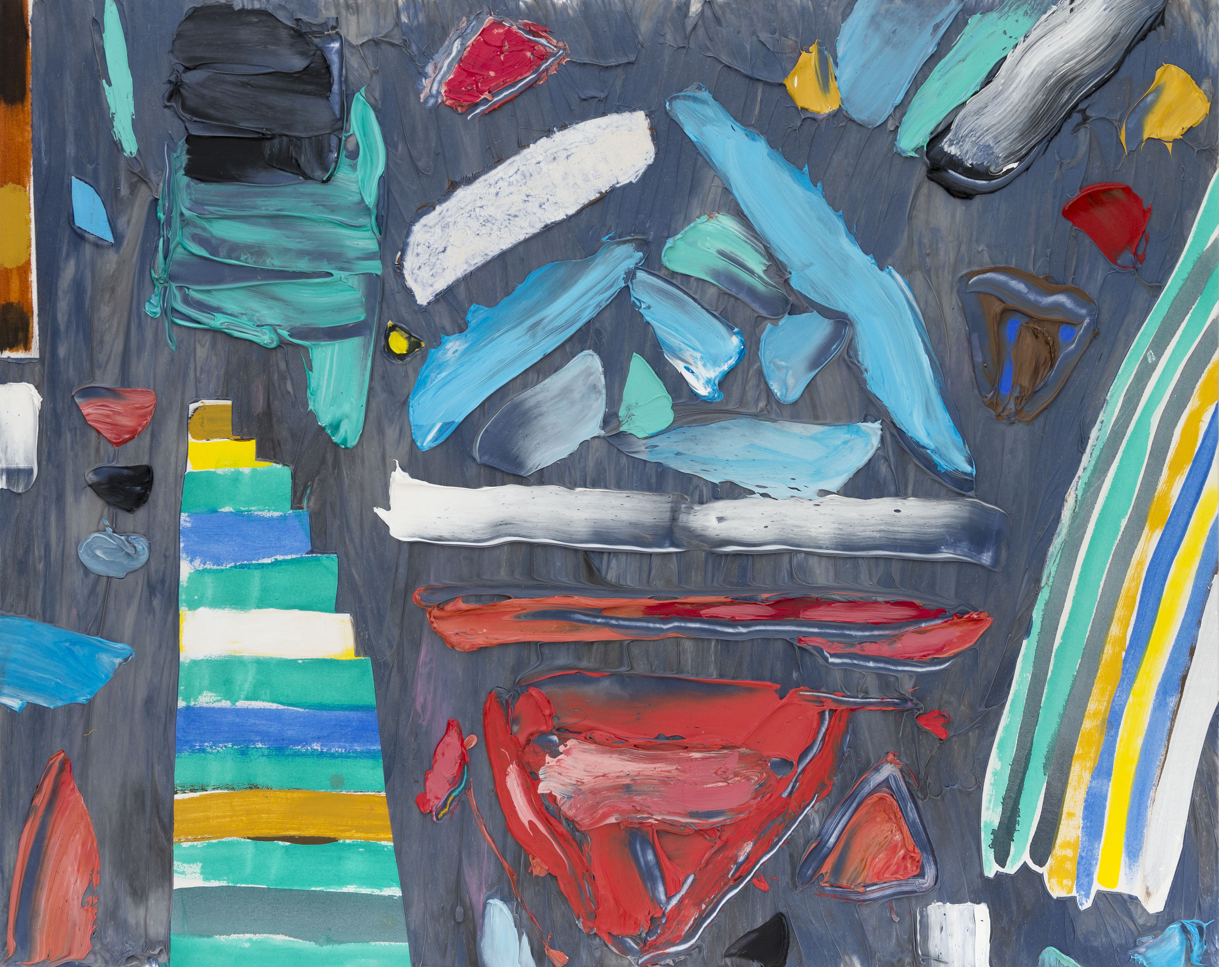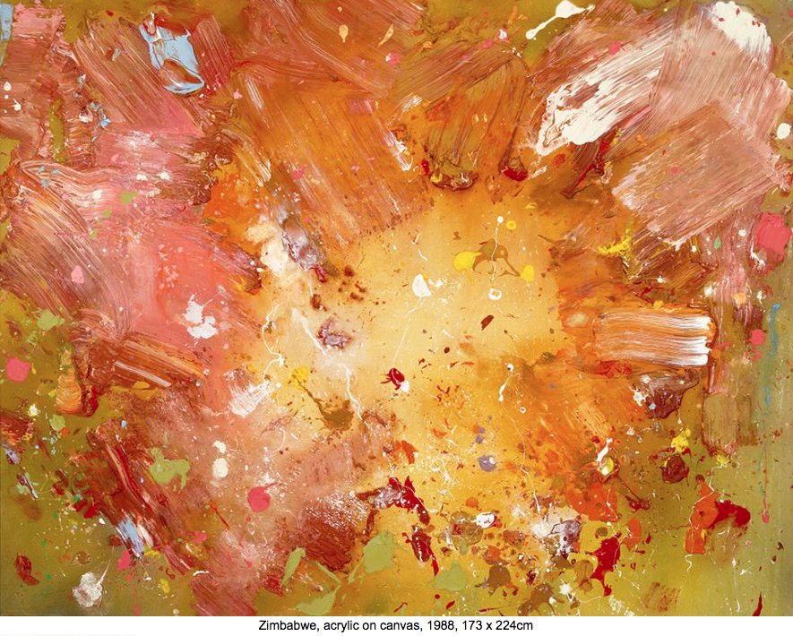 Graham’s achievement is, at this late mature stage of his career, to have brought powerfully together all the periods of his past work on each singular canvas. Here are the structures of his grids deconstructed, reconstructed and disturbed, not naked but adorned. Elsewhere we find are the blobs of beautiful gunk artfully chucked at canvas that I suggest have their origins in his American influenced painting of expressionistic action and intent that flourished in the early eighties. Now these cosmic and existential attributes have been married, integrated and conducted within the structures that had their day in the sixties with his grids and lines and boxes. And here we find the little square of red, (“Hector”) so necessarily and deliberately placed. Remove any item and the experience is gone. Add more and you’re hammered.