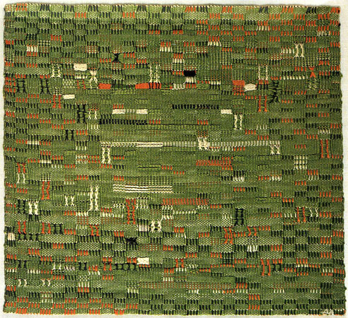 “Ancient Writing”, 1936, is for reasons of conservation shown horizontally at Tate. I enjoyed the experience of this way of presentation all the better because it partially removes the reading of a dominant design or image – the problem that troubles much of this work when it is reproduced in books or online (like here! And this is a very poor image). In some of Albers’ early works they appear to take on board a connection to the anecdotal subject-matter and/or pictorial compositions of Paul Klee and Josef Albers. “Ancient Writing” transcends those problems when viewed on the flat. Physicality in the interaction of the different sizes, colours, shades, textures and patterns of the threads, and how they build together into an intricate whole, is brought to bear explicitly on our view of the object. For example, the borders of this work (to say nothing of the rest of it) demonstrate eight or ten (I lost count) extraordinarily beautiful and captivating expressions of how with very few and hushed colours the warp and weft of the fabric can be mutated into entirely diverse adjacent elements, one to another in differently-sized bands. This is by no means the end of it, because the fabrics are confounded by silvery changes of pattern-in-depth on a microscopic scale. Its compellingly clever, this difficultly-conceived individual magic. (One should make a simple disclaimer, though – that such brilliant complexity in weaving has a long history. See later examples!)