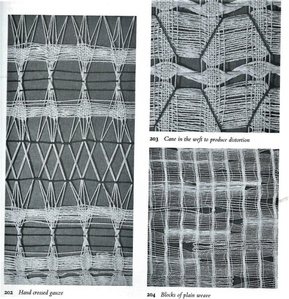 This work (above) entitled “Development in Rose 1” is from 1952, made of linen, and measures 57 x 43 cm. It undoubtedly utilises many traditional and long-established techniques of weaving that go back in some cases hundreds of years, whilst others are perhaps more recently developed uses of newer loom technologies. How these skills are utilised are simultaneously both fascinatingly simple and mind-blowingly complex – and slow and time-consuming too. There are in these procedures numerous ways and means of adjusting at the outset – and during the later stages – the relationship between the arrangement of warp and weft, and one or more of these methods Albers employed in a number of variations in these works, namely, that of the cross-warp or hand-crossed “gauze” technique, as seen in the examples above. In this process the fabric is opened out and articulated spatially in different ways and at untold different places, by different degrees, to bring about active and dynamic relationships of space and depth that are anything but flush to or adjacent with surface. The warp and weft are turning in and out and back and forth upon themselves. We see Albers teasing out the numerous changes to each and every variation of the fastening and unfastening of the fabric, combined with all the variations possible within each established organisation, as the work is built up. All of this is achieved with satisfying combinations of extemporisation and pre-determination.