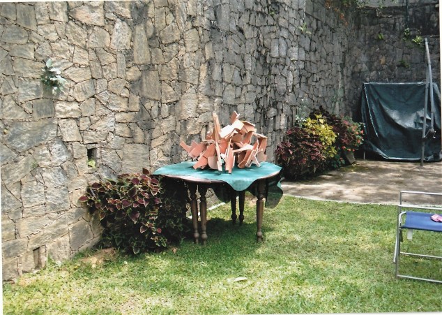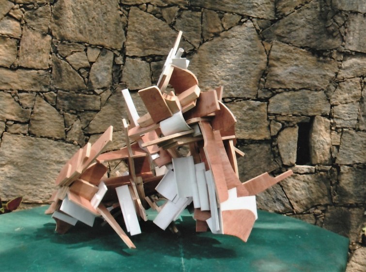 Tim sent me an unsolicited picture – see below – of a sculpture in his garden (with the beautiful stone wall) in Sri Lanka where he works six months of the year. I immediately asked for more. I’ve never seen these works beyond these photographs, and my guess is they may not easily get shown over here, things being as they are in the artworld. But from what I can see, and from what I can make as my best guess, it is not only Tim’s best work by far in plywood since he started showing in this medium at Poussin Gallery in 2011, but is his best work ever. I say that as a fan of some of his early work from the sixties and seventies, such as the “Bird in Arras VI” series that I wrote about in September in Abcrit, and someone who has appreciated much of his work in steel, both forged and constructed, especially the extended series made in Germany in the eighties and nineties. We can look forward to a book on Tim in the not too distant future, being written by Sam Cornish, examining all his work and history.