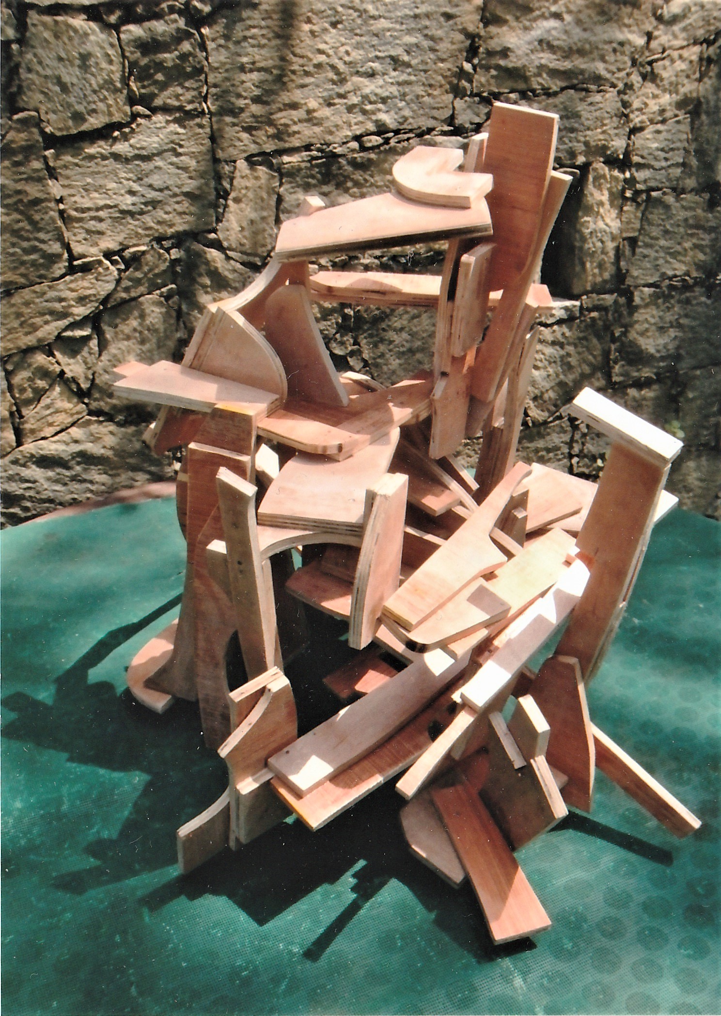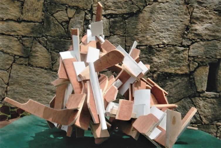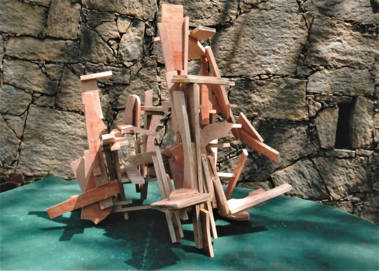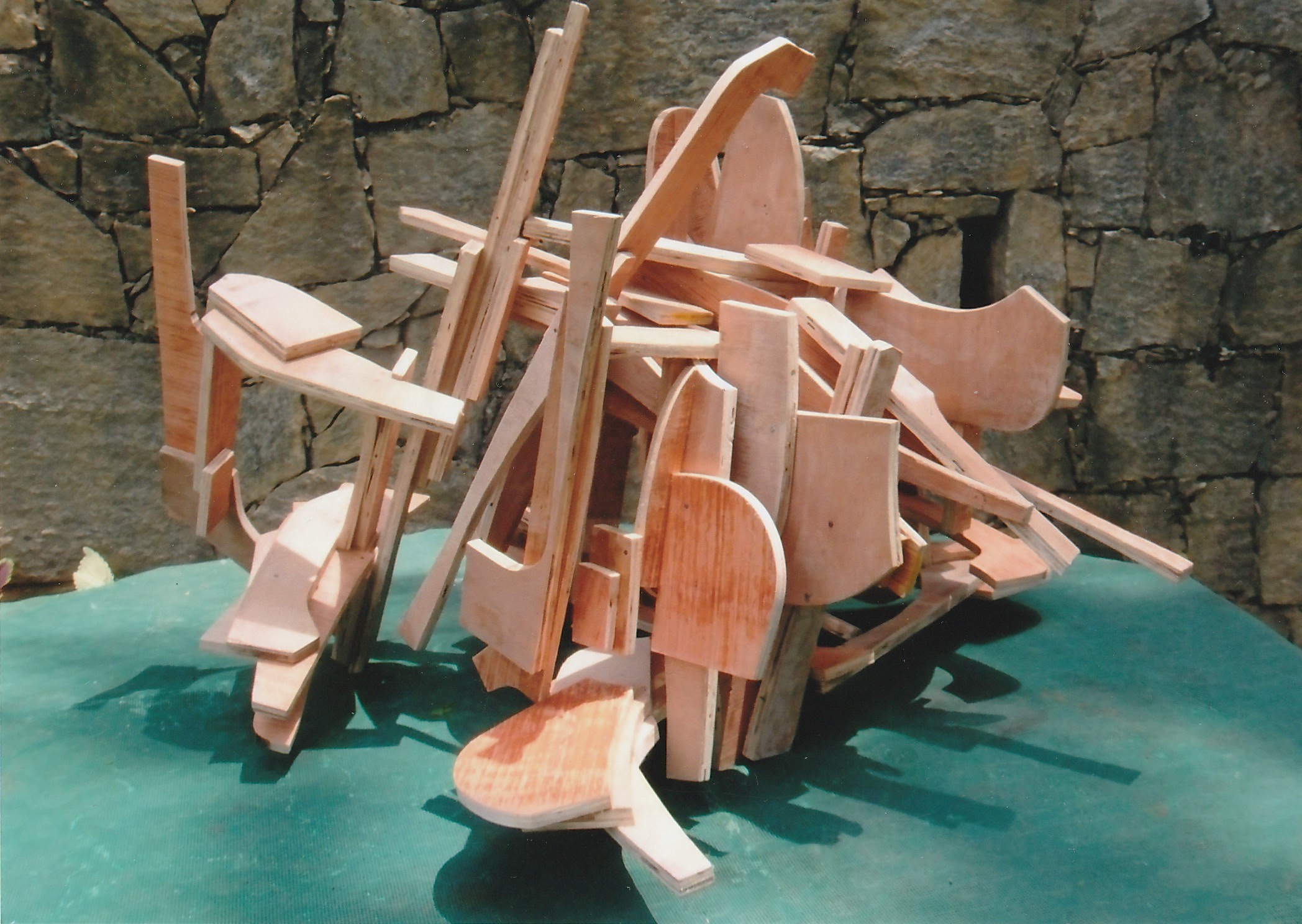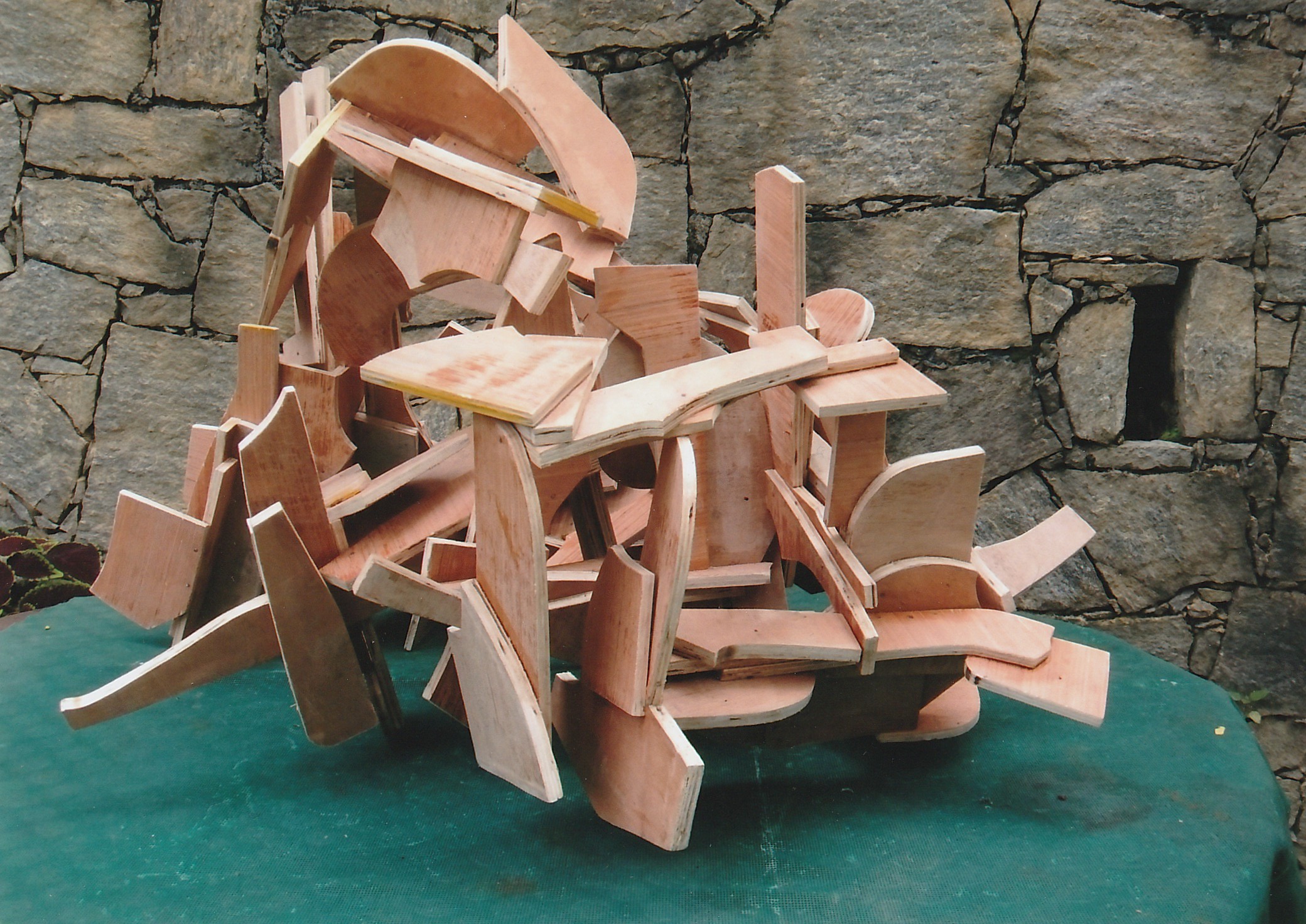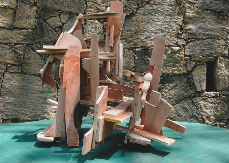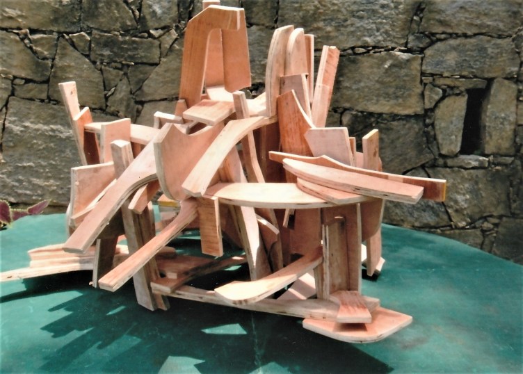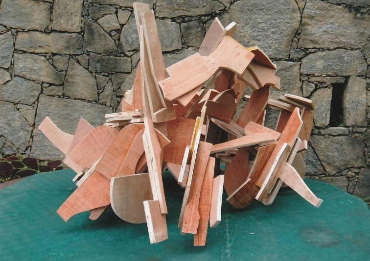 Let’s agree that the material itself – the plywood, in this case – is no longer an issue or even a “limitation”, but now is a question of how far one can variably invent with it to make more certain of its arrival at whole-form three-dimensional movement-structures. Then, I see no “flatness” to plywood (or to steel, for that matter). I’m now trusting fully to the idea that plywood and steel are already being made to provide more freedom than in previous “ideas” related to forging.