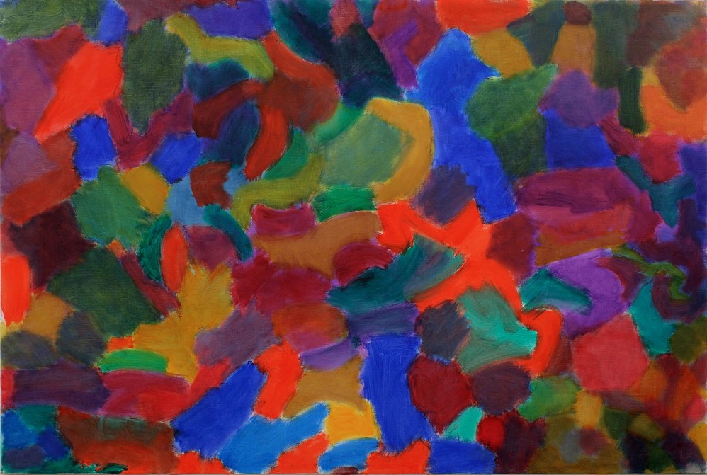 I remember Pat Heron described his work in the ’70s as “wobbly hard edged”, ie Interlocking shapes of hard edged colour without a straight line in sight and certainly no taping. similarly I think of mine as orderly disorder, it has an orderly structure applied in a disordered way with no taping.